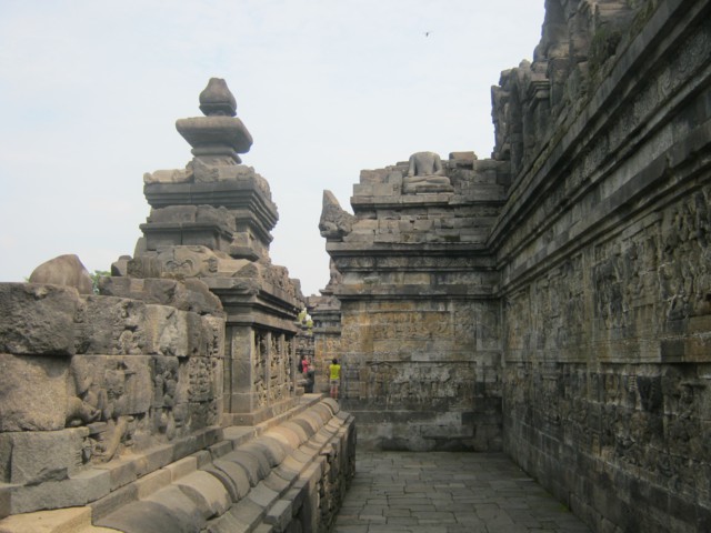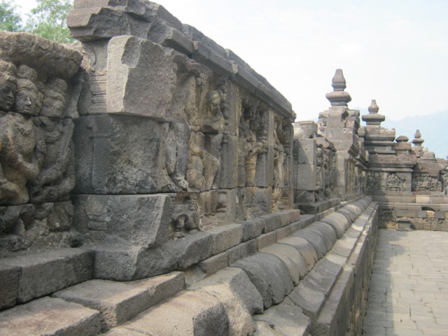 Tất cả các tường thành đền Borobudur đều được phủ kín những phù điêu, được chạm trổ rất công phu, mô tả về cuộc đời Đức Phật Thích Ca Mâu Ni từ đản sinh đến khi thành đạo. Ngoài ra, trên các bức tường còn điêu khắc những vị Bồ Tát và các Đại đệ tử của Đức Phật với sự chạm khắc khá công phu và tỉ mỉ.