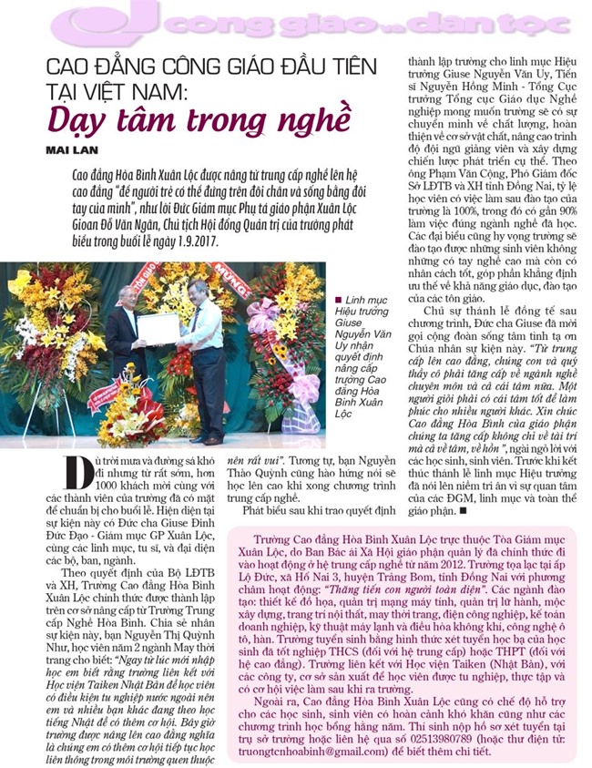 Như chúng tôi đã đưa tin, trường Trung cấp Hòa Bình Xuân Lộc chính thức trở thành trường Cao đẳng Công giáo đầu tiên tại Việt Nam sau năm 1975 kể từ ngày 1.9.2017. Báo Công giáo và Dân tộc (CGvDT) đã có cuộc trao đổi với linh mục Hiệu trưởng Giuse Nguyễn Văn Uy (Lm NVU) về các hoạt động của trường trong tương lai.