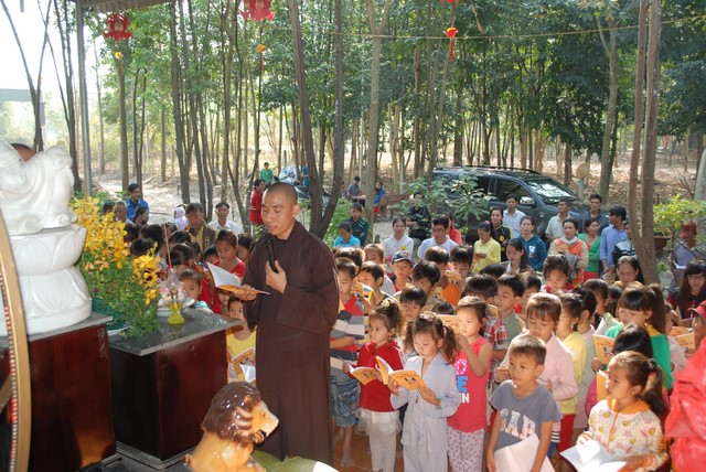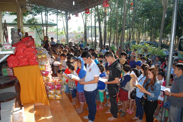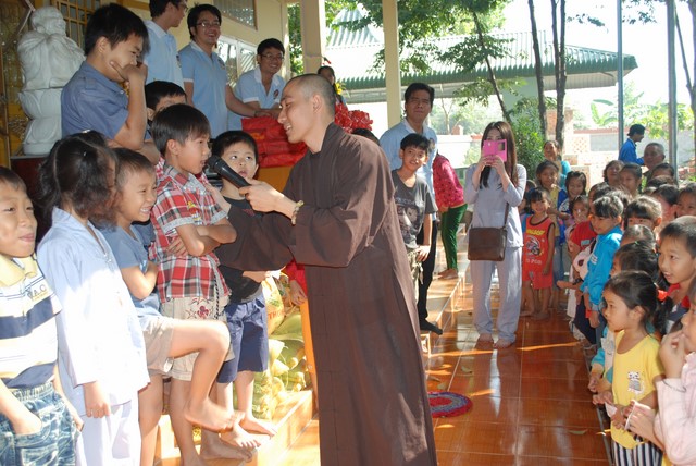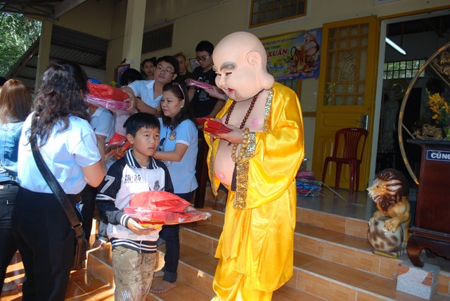 Qua các phần Lễ Phật, Tụng kinh vui chơi cùng các em thiếu nhi là phần mong đợi nhất của các em. Sau khi nghe tiếng goi của các em, là hình ảnh hóa thân của Đức Phật Di Lặc bước ra với môt bi vải lớn đưng quà trên tay. Khi những phần quà được Đức Phật Di Lặc trao tận tay đến các bé, các cụ già đó cũng là lúc những nụ cười hạnh phúc hòa cùng tiếng gọi tên nhau í ới chia sẻ niềm vui nhỏ bé nơi cửa Phật. Món quà nhỏ bé tuy không nhiều nhưng đó là tấm lòng của các nhà mạnh thường muốn chia sẻ đến các em và các cu già.