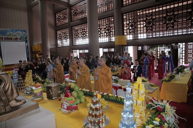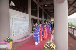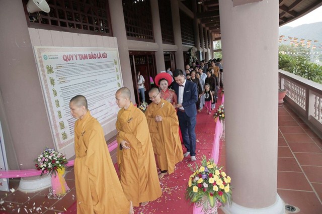 Đúng 9 giờ sáng, ban nghi lễ đã cung nghinh chư tôn đức quang lâm chứng minh cho buổi lễ hằng thuận, cùng tân lang tán nương từ văn phòng BTS lên chính điện chùa Linh Quang để chính thức cử hành nghi lễ hằng thuận.