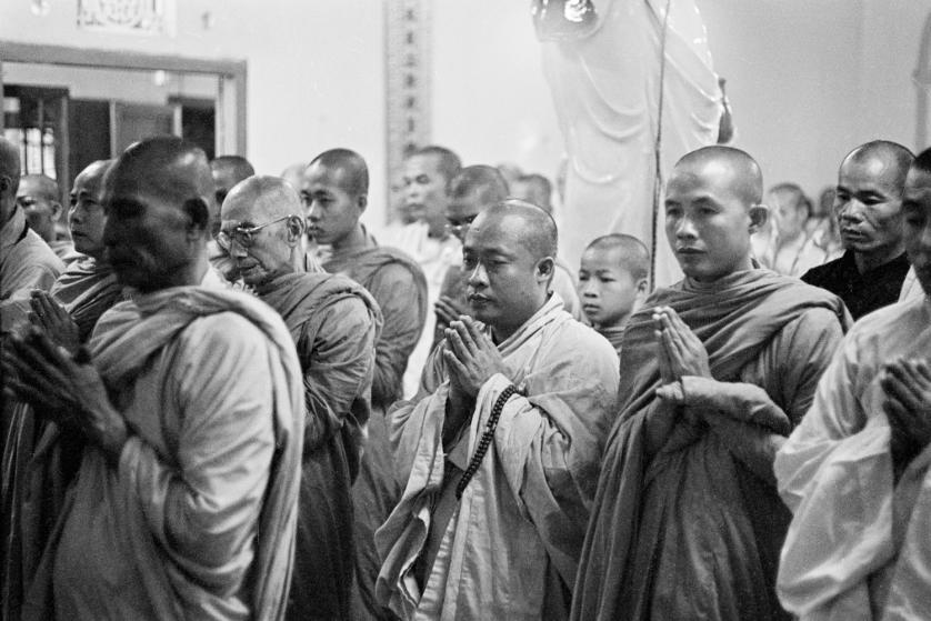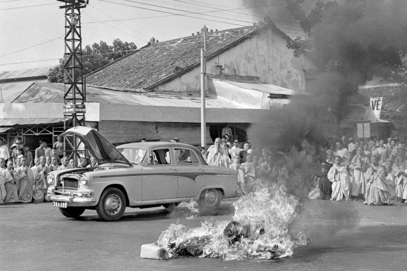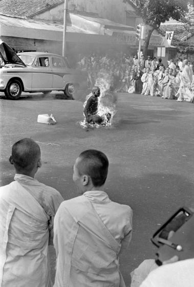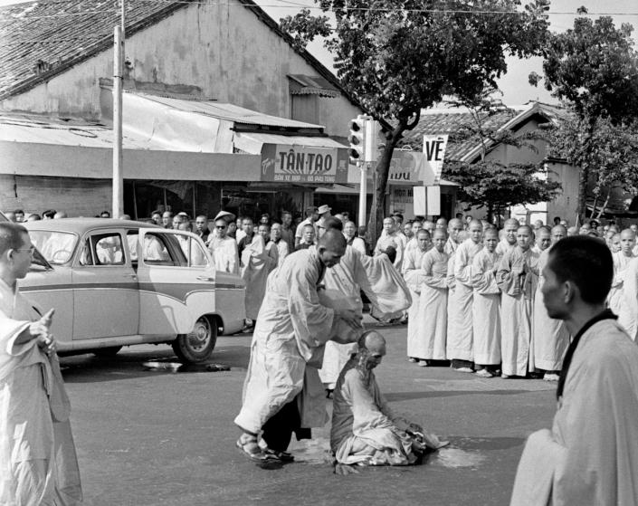 CHƯ TĂNG NI CẦU NGUYỆN TRƯỚC NHỤC THÂN CHÁY ĐEN CỦA NGÀI THÍCH QUẢNG ĐỨC TRONG KHI TRẦN VĂN HÀ TỨC TỐC TRỞ VỀ VĂN PHÒNG AP CHUYỂN HÌNH ẢNH ĐI CHO THẾ GIỚI BIẾT SỰ KIỆN