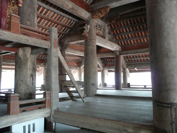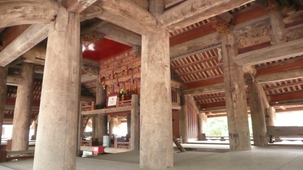 Với diện tích sàn 395 m2, kết cấu khung gỗ chồng rường truyền thống, với đầy đủ 6 hàng cột: 2 hàng cột cái (đường kính 60-81 cm), 2 hàng cột quân (50 cm), 2 hàng cột hiên (50 cm), đối xứng với nhau qua trục dọc nhà. Khung cột kiểu "Thượng thu hạ thách". Bốn cột cái lớn gian giữa (chính điện) có đường kính tới 81 cm. Hai đầu hồi cũng có 1 hàng cột hiên ở mỗi hồi, quay vuông góc với hàng cột cái, và các cột hiên này nằm cùng trục dọc với 6 hàng cột dọc. Hàng cột hiên đỡ hệ thống kẻ bẩy ở 4 phía mặt đình. Các kẻ hiên được nối liền, gác lên các cột quân. Nối giữa các đỉnh cột quân với cột cái, là các rường cụt, và cột cái với nhau là hệ thống xà, vì kèo giá chiêng kiểu chồng rường con nhị. Trên hệ kết cấu khung gỗ: kẻ bảy, rương cụt, ván nong (ván măng), là những tác phẩm điêu khắc dân gian tinh xảo, miêu tả các cảnh chọi gà, gảy đàn, hát múa dân gian, người cưỡi hổ, cưỡi ngựa, các họa tiết trang trí linh vật như: phượng mẹ và đàn phượng con, rồng là đề tài chủ đạo ở đây và được thể hiện bằng nhiều cách khác nhau.