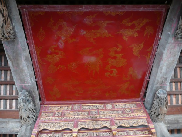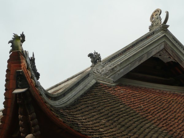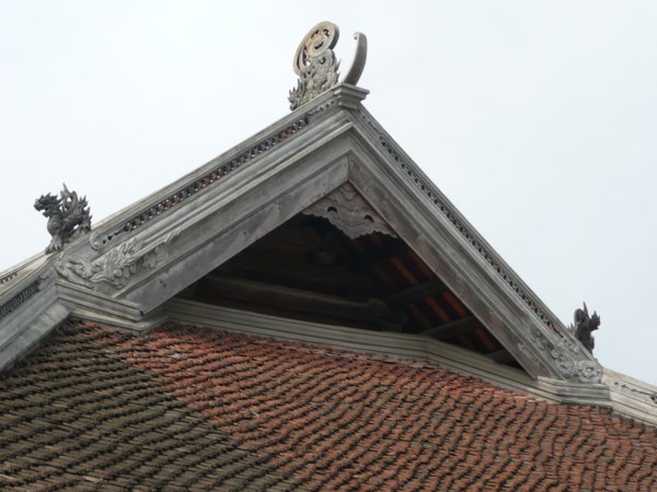 Kết cấu nóc là kiểu 4 mái dốc (hai mái dốc chính và hai mái phụ vuông góc che 2 trái và 2 hiên đầu hồi), với 4 đầu đao vút cong thanh thoát ở 4 góc mái. Trên mái là hệ thống tượng điêu khắc bằng gốm thể hiện các linh vật: con xô, con kìm nóc (cá hóa rồng) trên các bờ nóc, góc mái, đầu đao.