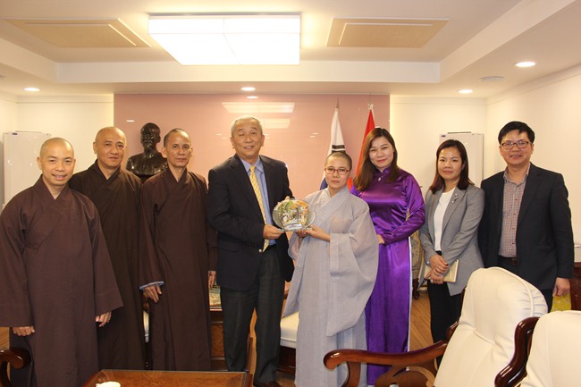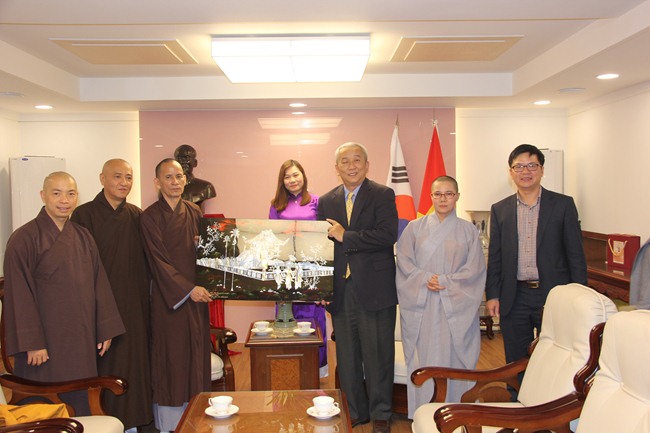 Cùng ngày, Đoàn lãnh đạo Trung ương Giáo hội Phật giáo Việt Nam đã đến thăm Đại sứ quán Việt Nam tại Hàn Quốc. Đại sứ Đặc mệnh toàn quyền Nước Cộng hòa Xã hội Chủ nghĩa Việt Nam tại Hàn Quốc – Ngài Nguyễn Hữu Tú tiếp đoàn và thông báo tình hình cộng đồng người Việt Nam tại Hàn Quốc, kết quả hoạt động Phật sự của Hội Phật tử Chùa Pháp Môn Việt Nam tại Hàn Quốc thời gian qua.