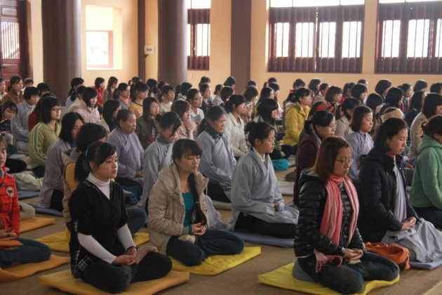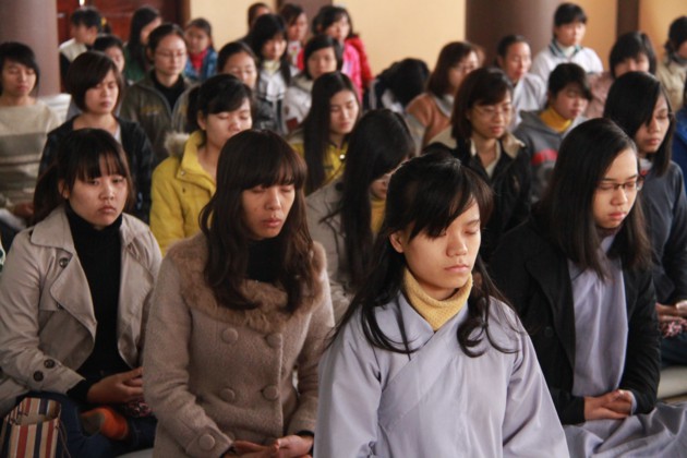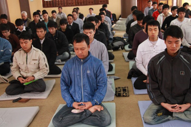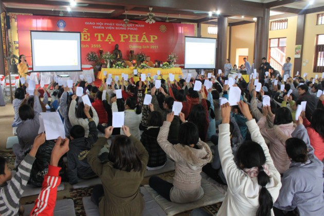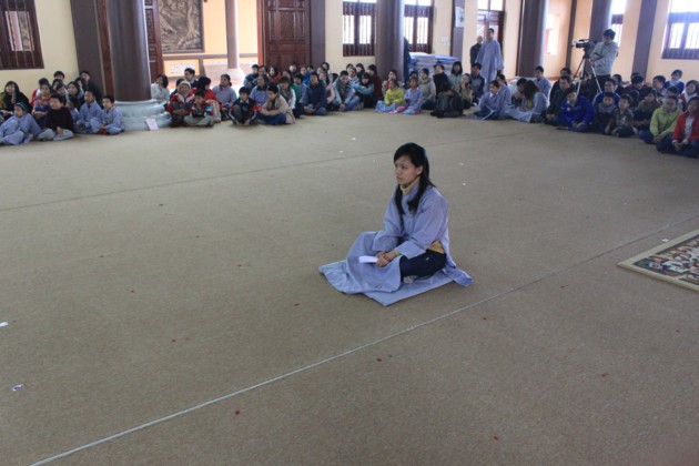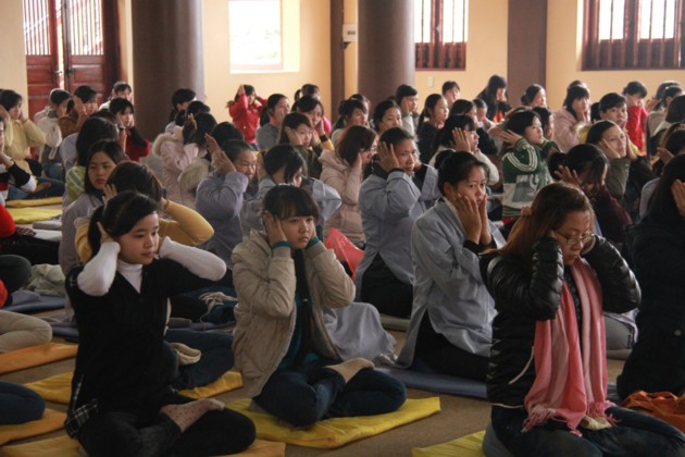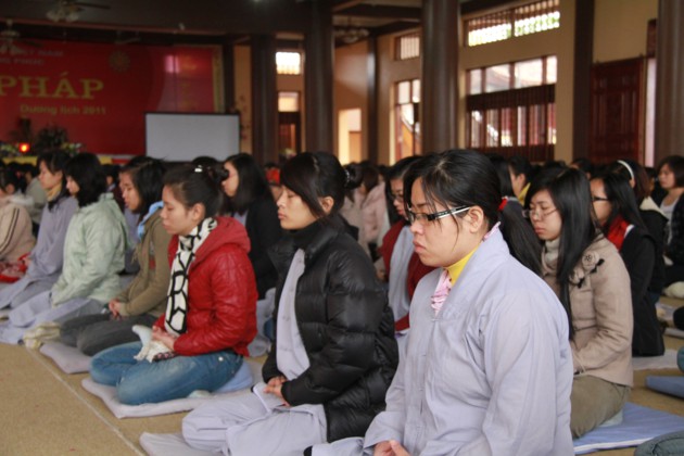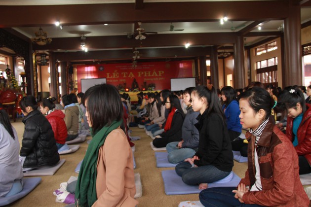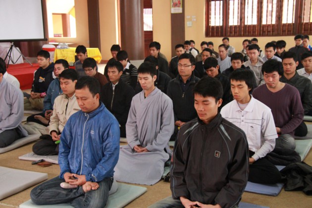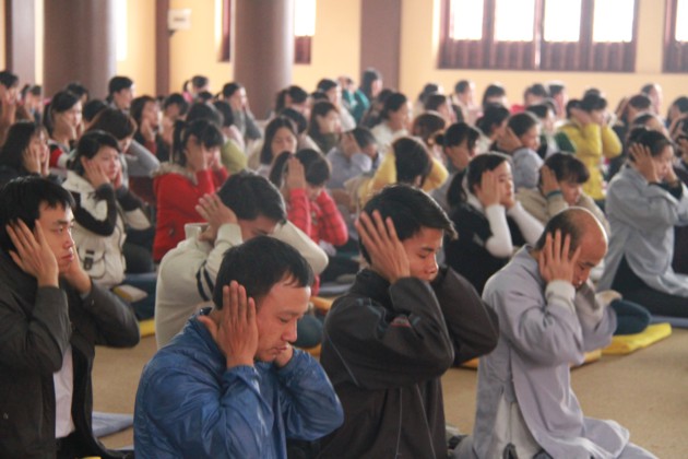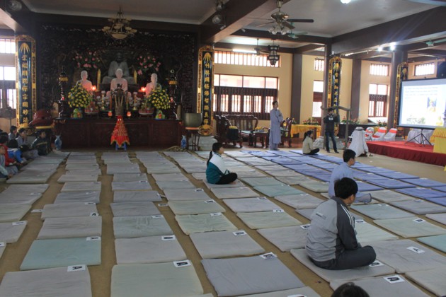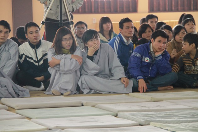 Thời khoá tu tập được bắt đầu vào 7h30 với nghi thức tụng sám hối sáu căn và tụng giới. Sau nghi lễ sám hối, ĐĐ. Thích Trúc Thái Phước đã hướng dẫn các thanh niên phật tử cùng hơn 100 bạn sinh viên đến từ trường ĐH Khoa học xã hội & nhân văn cách tọa thiền. Vào thời khóa nghe pháp, các bạn được ĐĐ. Thích Trúc Thông Tánh – người sáng lập đoàn giảng về Thiền tông và tông chỉ của thiền phái Trúc Lâm Yên Tử.