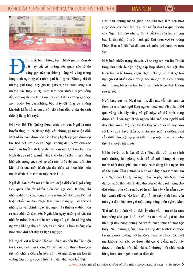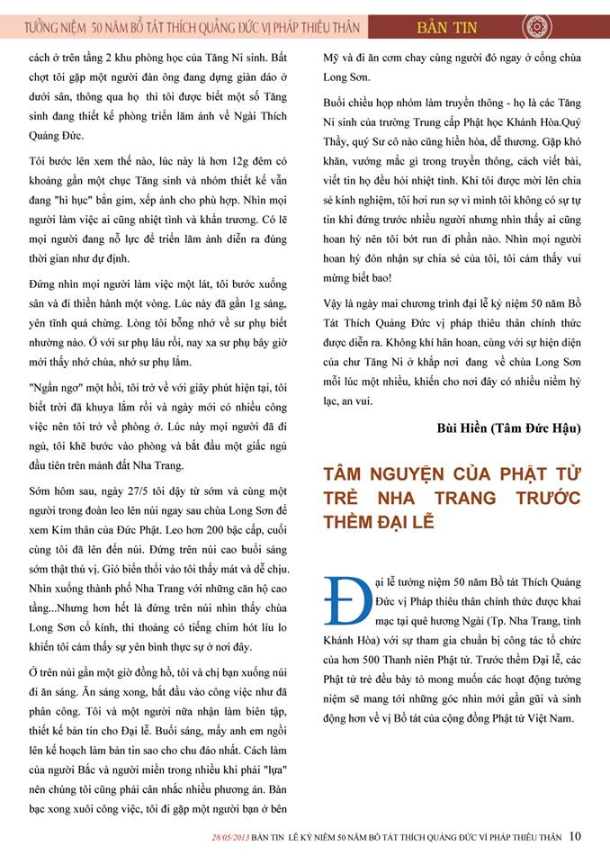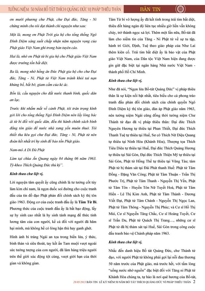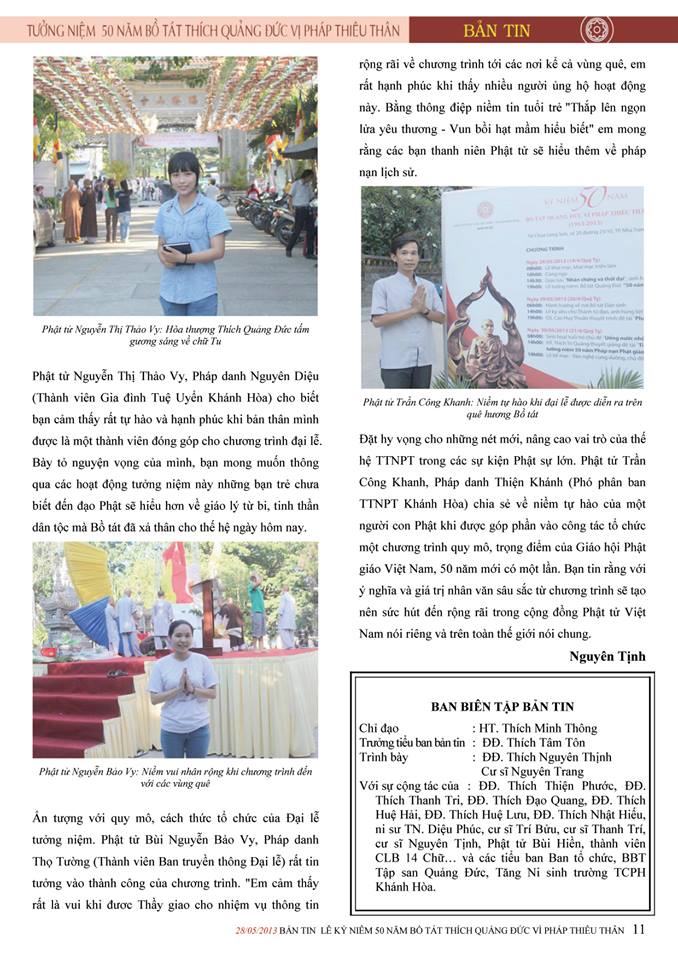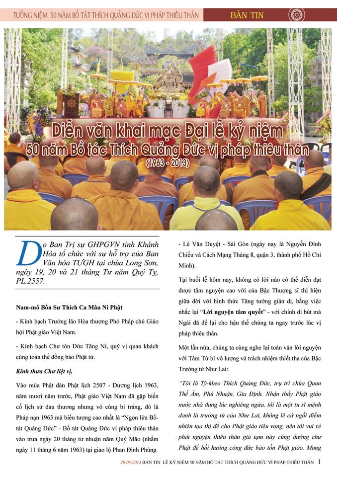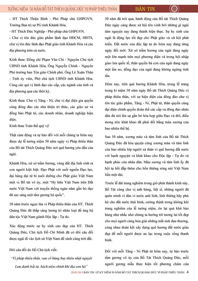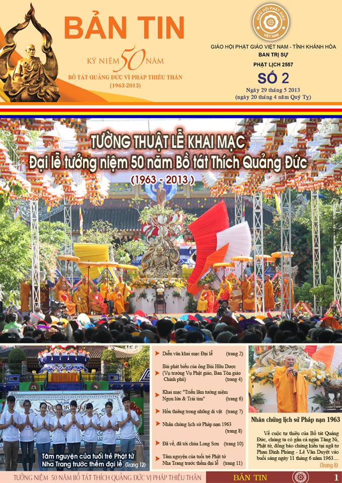 Bản tin nhanh cập nhật các hoạt động đang diễn ra tại Đại lễ kỷ niệm 50 năm Bồ tát Thích Quảng Đức vị Pháp thiêu thân số 2 gồm 12 trang khổ A4, in 4 màu, cập nhật tin nóng nhất và tin quan trọng của sự kiện này, bao gồm toàn bộ diễn tiến của phiên khai mạc chính thức Đại lễ vừa diễn ra cùng các chuỗi sự kiện khai mạc triển lãm, giao lưu “Nhân chứng và thời đại”, các hoạt động bên lề trong công tác chuẩn bị, phục vụ đại lễ của TTNPT Khánh Hòa…, cảm xúc, tâm tư của chư tôn đức Tăng Ni, Phật tử đại biểu về công đức hy sinh to lớn của Bồ tát Thích Quảng Đức đã được đăng tải với hình ảnh sinh động…