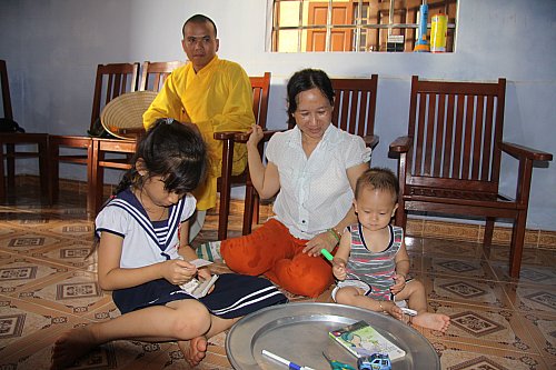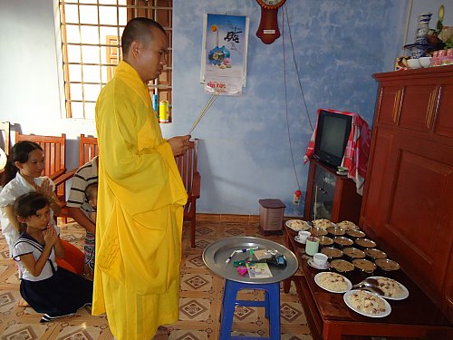 Chiều cùng ngày, trước khi ra tàu để đi sang đảo Trường Sa Đông, chúng tôi ghé thăm nhà cô giáo Bùi Thị Nhung là cô giáo duy nhất trên đảo Trường Sa lớn, đã thấy Đại đức qua giúp gia đình làm lễ cúng Phật và gia tiên, nhân một năm lễ thôi nôi con nhỏ của chị.