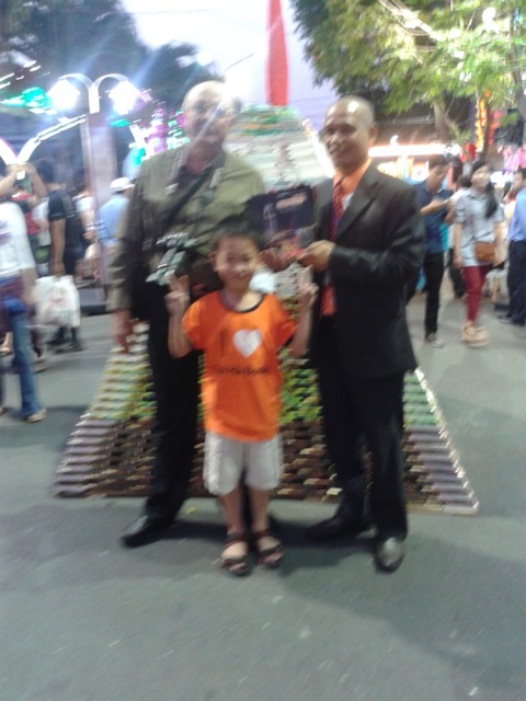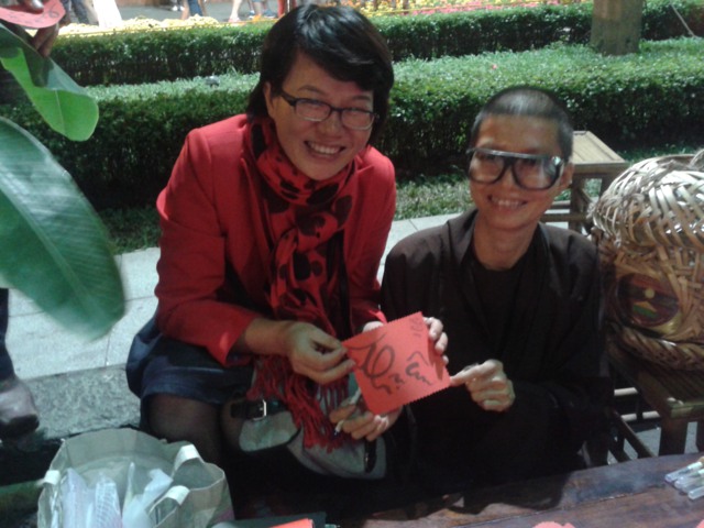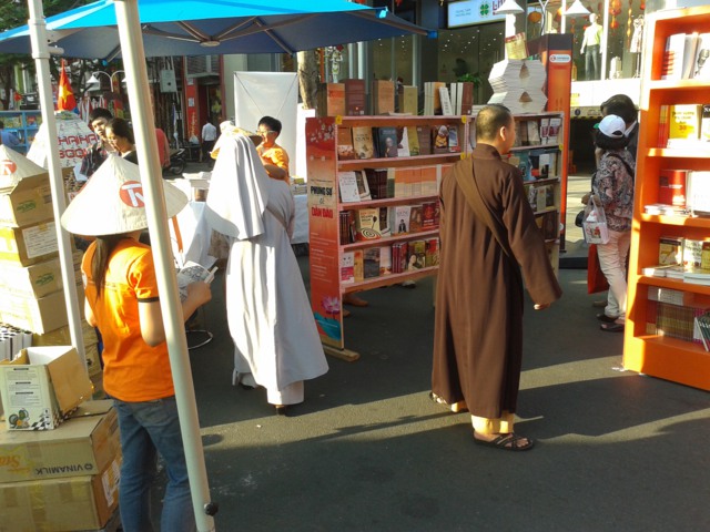 Cũng như tất cả các ngày từ 27 tết, chiều 30 chúng tôi lại có mặt tại Lễ Hội Đường Sách. Ở đây các bạn trẻ tình nguyện viên nhóm Trăng Rằm pha trà mời bạn đọc. Sư cô Thiện Phương thì viết thư pháp tặng khách tham quan. Tôi lại có may mắn tiếp các quý thầy, quý sư cô, quý bạn đọc tìm với Tết của Sách trên đường Nguyễn Huệ. Đông vui vô cùng.