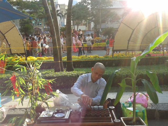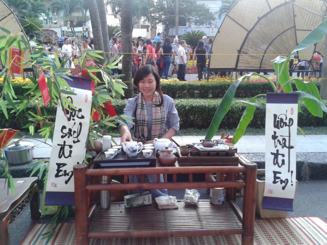 Biết chúng tôi có chương trình “Uống trà đi em! Đọc sách đi em”, nhiều bạn trẻ tình nguyện đến pha trà mời khách và vui tết. Nguyên Minh, Mỹ Lệ, Anh Thư, Yêu Thương,… thay nhau làm trà chủ mời bạn đọc vui xuân trên Đường Sách Nguyễn Huệ. Có đến cả chục loại trà ngon thượng hạng được các bạn mang ra pha và mời khách. Nhiều khác nước ngoài cũng đến thưởng thức. Nhiều người khen ngợi và thậm chí muốn hỏi mua trà nhưng… trà ngon ai bán mà mua, chúng tôi chỉ pha mời khách để vui tết thôi mà.
