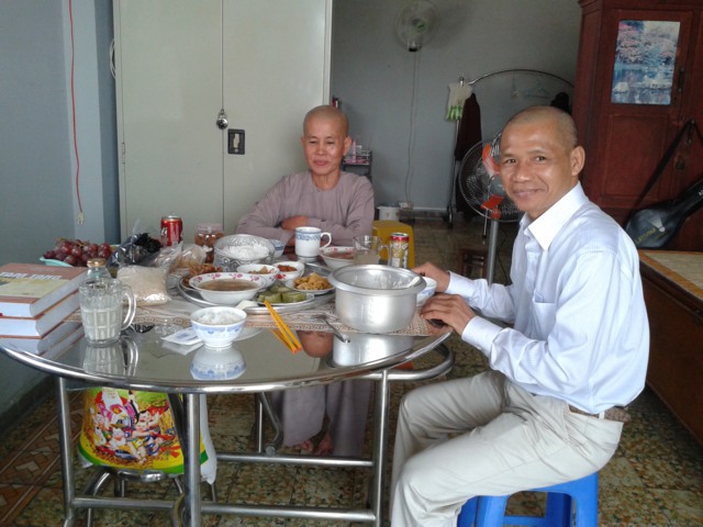 Bữa cơm tất niên trưa 30 tết chúng tôi ngồi ăn trong chùa cùng Ni sư Như Hiền vô cùng ấm cúng và tình người. Bữa cơm thanh đạm mà ngon đến kỳ lạ. Biết tôi từ Hà Nội vào nam ăn tết, Ni sư dành những món ngon nhất để chiêu đãi. Tôi rất thích bánh tét trong bữa tất niên này, bởi ngoài Hà Nội không có.