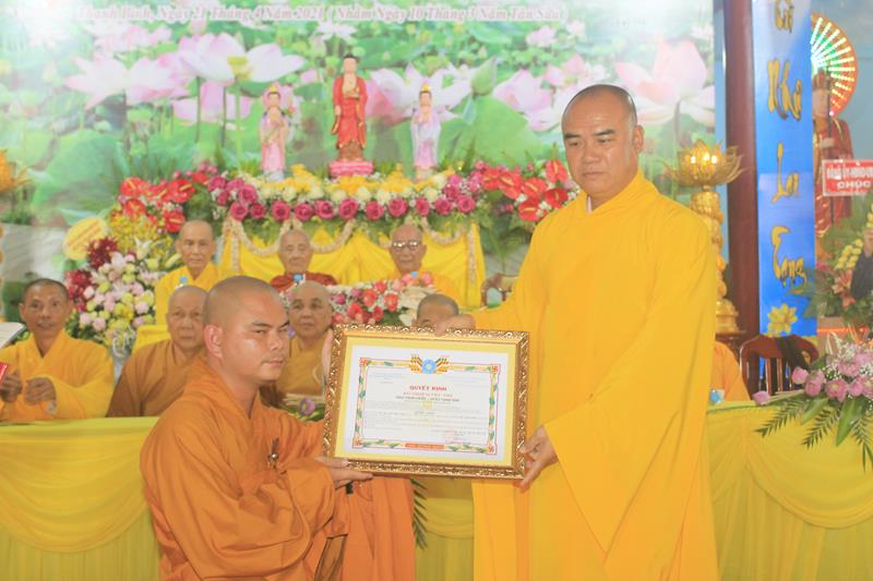 Tiếp nhận quyết định bổ nhiệm, Đại đức tân trụ trì cung đối trước chư Tôn Giáo phẩm chứng minh dâng lời phát nguyện với tâm nguyện “Trụ pháp vương gia, trì Như Lai tạng”, trọn đời phụng sự Đạo pháp và Dân tộc, luôn tuân thủ theo Nội quy Ban Tăng sự và Hiến chương GHPGVN, cũng như Pháp luật của nhà nước quy định, hướng dẫn tín đồ Phật tử tại địa phương tu hành đúng chánh pháp. Xây dựng ngôi Già lam ngày càng vững mạnh trang nghiêm, ngõ hầu báo đáp thâm ân Phật tổ. Đồng thời, Đại đức tân trụ trì cũng gửi lời tri ân quý cấp chính quyền đã tận tình giúp đỡ trong thời gian qua và rất mong sẽ tiếp tục nhận được sự ủng hộ quý báu đó.