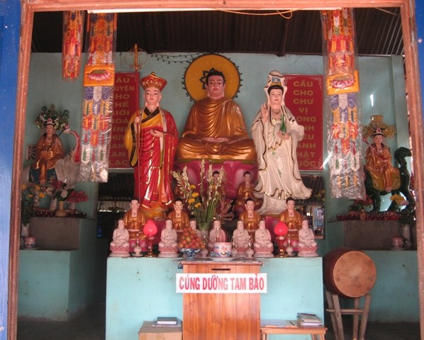 Ngôi chính điện chưa được xây dựng, nhưng bà con Phật tử đã cùng thầy dựng lên một căn nhà cột gỗ, lợp mái tôn để làm nơi tụng kinh, trì chú, niệm phật.