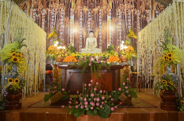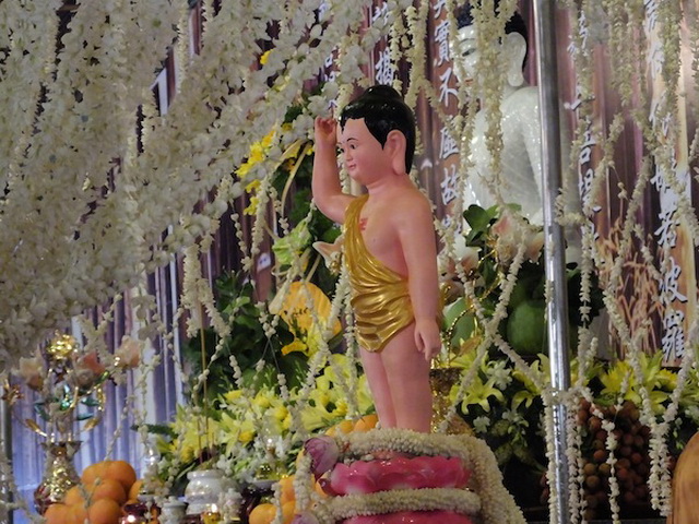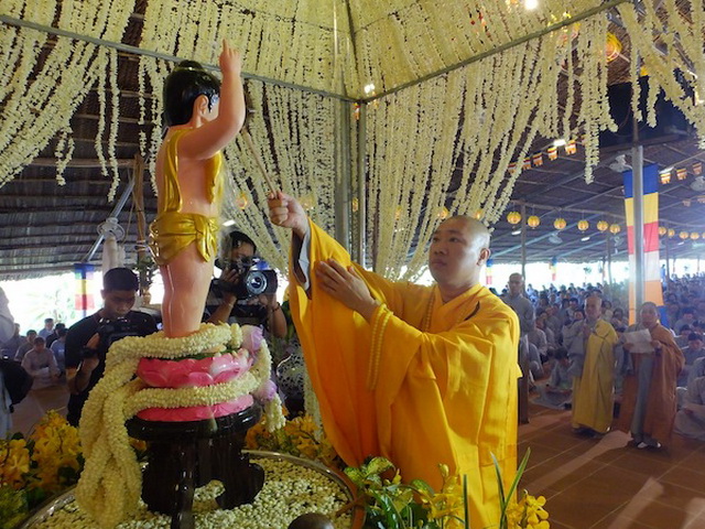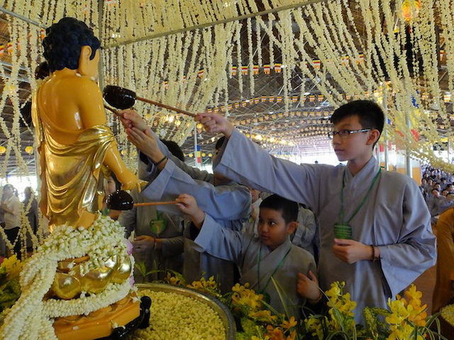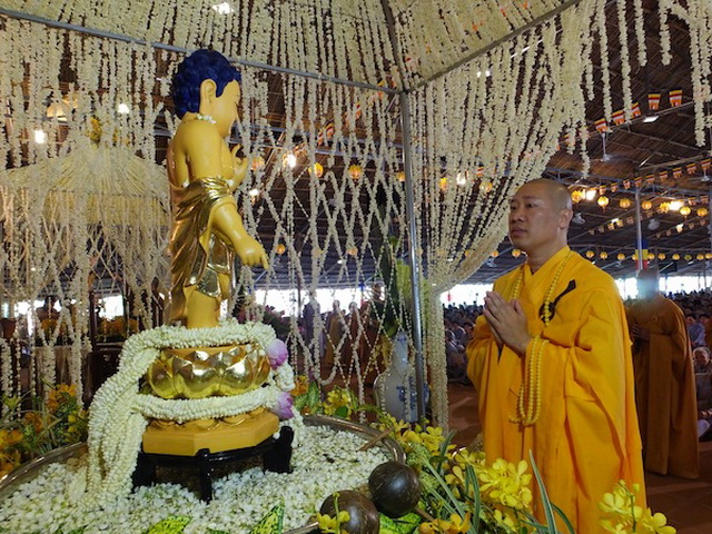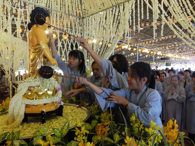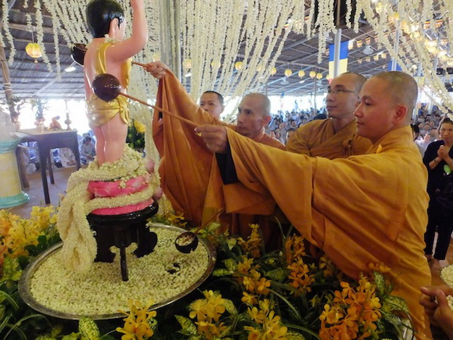 Gần 200 Phật tử về chùa trước ngày Huân tu để dọn dẹp chuẩn bị cho khoá tu và trang trí lễ đài Phật đản cùng với quý thầy. 2 lễ đài được thiết trí bằng hoa lài mang hương thơm tinh khiết quyện cùng hơi nước mát dịu cúng dường Đức Thế Tôn đản sanh. Hơn 4.000 nam nữ tín đồ trang nghiêm chắp tay cung thỉnh Chư Tôn đức quang lâm lễ đài Phật đản sanh. Sau khi khai kinh và tụng sám khánh đản, Chư Tôn đức bắt đầu hành lễ trong khi đại chúng hoà thanh bài kệ tắm Phật. Tắm Phật ở bên ngoài nhưng thực chất nương vào tôn tượng Đức Phật đản sanh mà tắm gội những tham giận si mê… ra khỏi tâm mình. Hành giả biết tắm gội tâm mình mỗi ngày như thế xứng đáng là những đoá hoa sen thơm ngát cúng dường Đức Thế Tôn bằng công đức tu tập của chính mình.