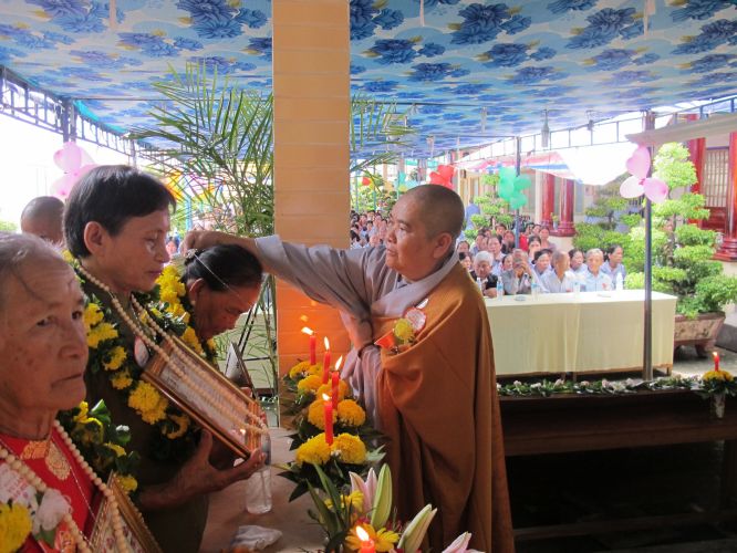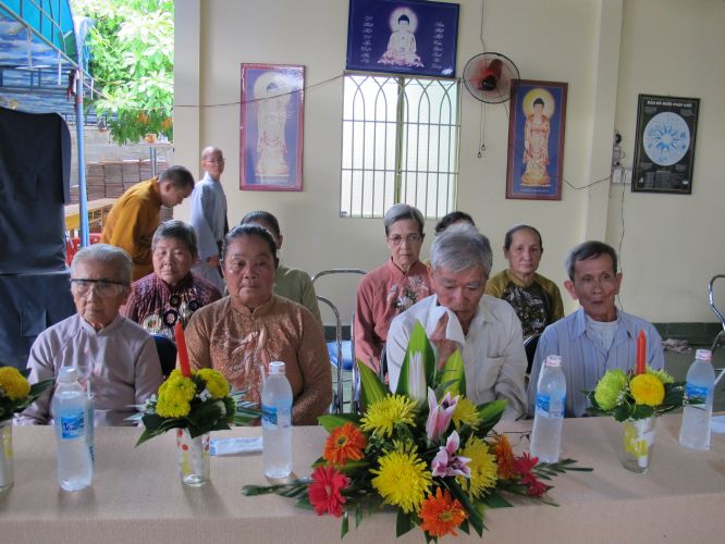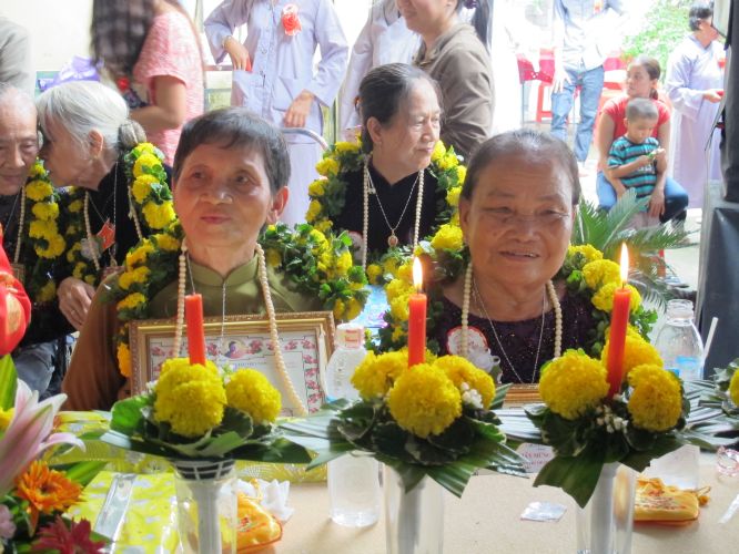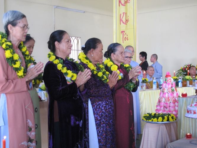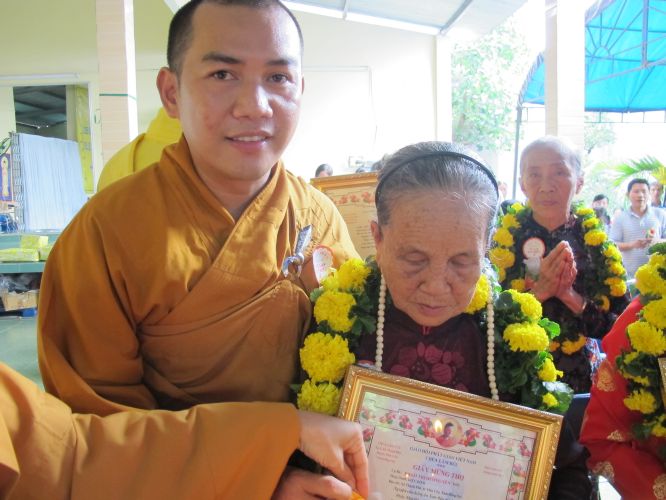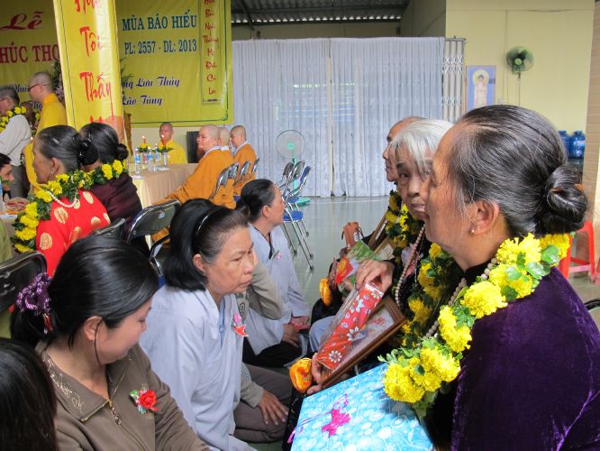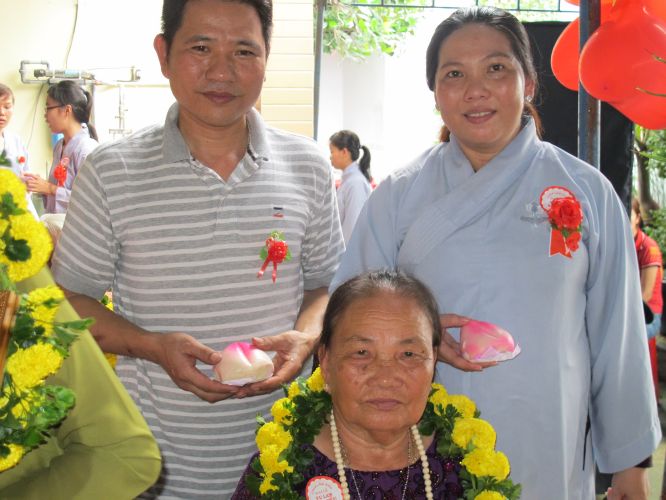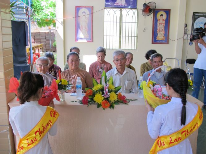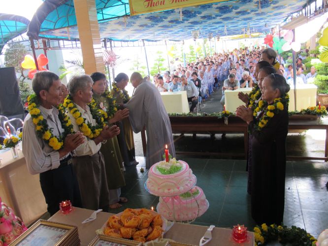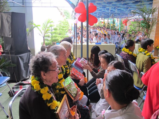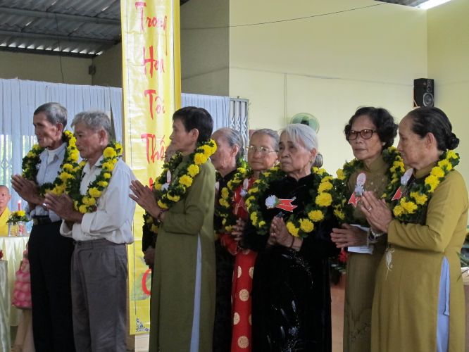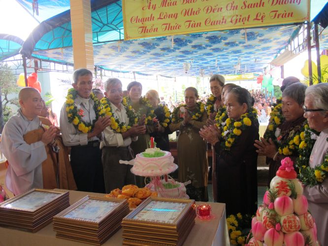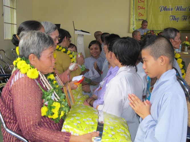 Chư tôn đức cũng đã trao những vòng hoa vạn thọ cho quý vị, gửi điều ước phước thọ mãi miên trường. Tại buổi lễ, chư tôn đức và sư cô trụ trì đã trao rất nhiều quà, lộc tặng mừng tuổi thọ các cụ. Mời các cụ thổi nến, cắt bánh sinh nhật. Giờ phút ấy cũng là thời khắc đề con cháu thể hiện tấm lòng hiếu để của mình, dâng những phần quà hiếu hạnh lên ông bà, cha mẹ. Vật mọn tuy đơn sơ, nhưng tấm lòng lại vô cùng ý nghĩa.