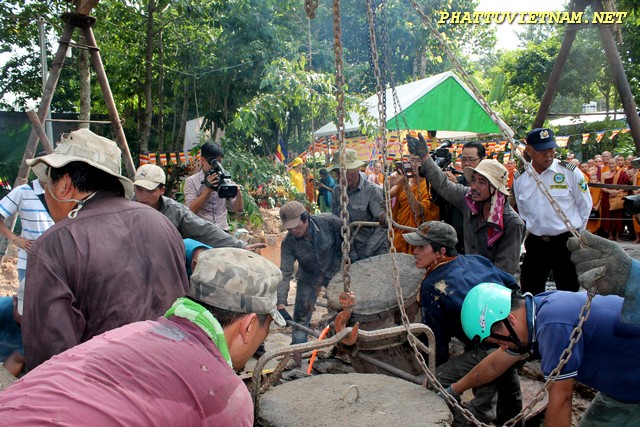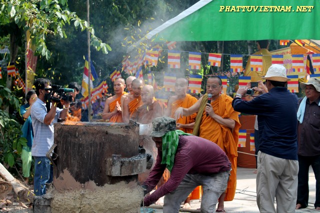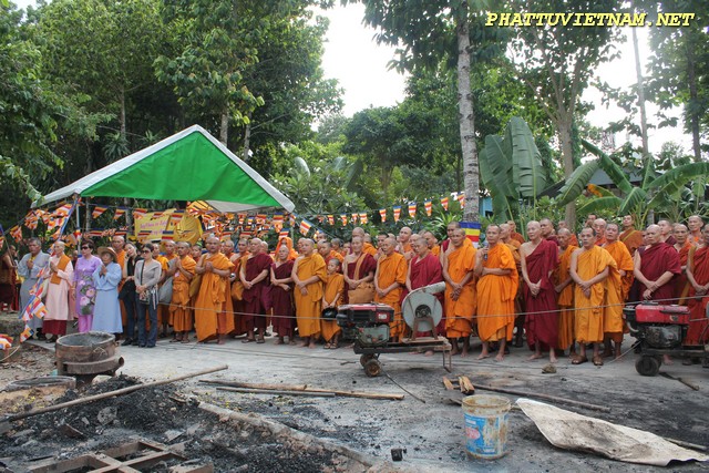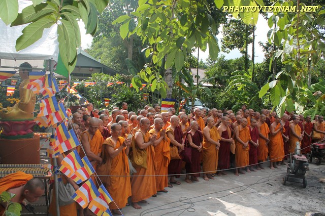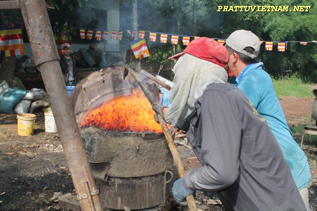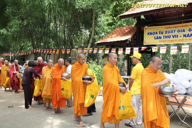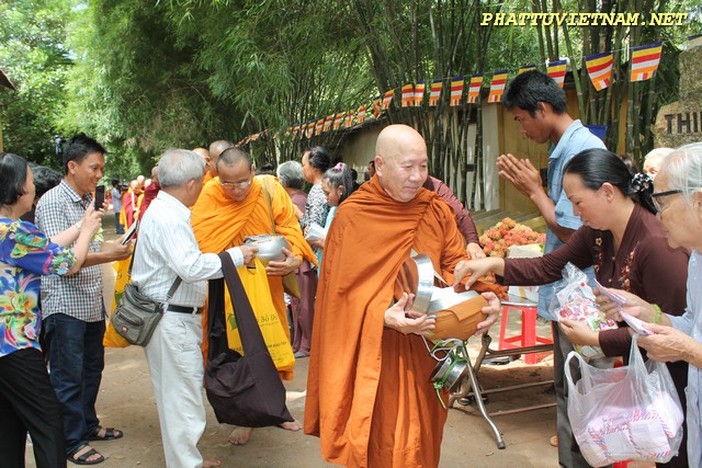 Sau nghi thức đúc đại hồng chung, chư Tăng – Tu Nữ đi trì bình khất thực do Phật tử và Cty thực phẩm Bình Tây (mì chay lá Bồ Đề) phát tâm cúng dường.