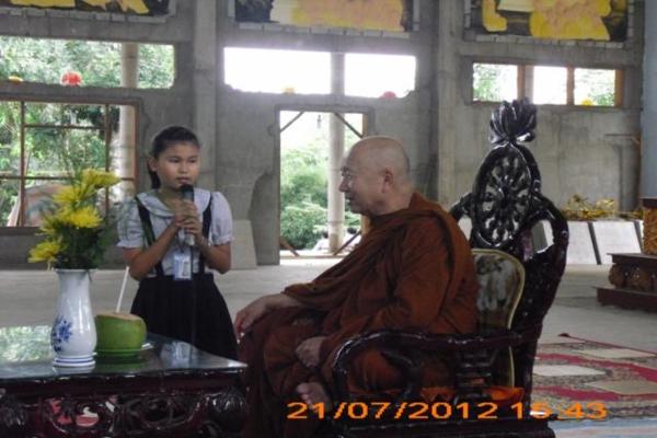 Thượng Tọa Bửu Chánh chủ trì buổi sinh hoạt nghành thiếu – oanh, sư đặt ra câu hỏi Nam Mô Bổn Sư Thích Ca Mâu Ni Phật có ý nghiã là gì? Lam là gì? Rất nhiều cánh tay giơ lên – nhưng chỉ có 01 bạn trả lời đúng ( Thầy và PV nhắc ). Sư dậy các bạn bài kệ LỜI NÓI, nhấn mạnh tầm quan trọng chánh niệm về khẩu ngôn, “ không nói thì thôi – nhưng khi nói thì đừng làm ai buồn – xót xa – rơi lệ khổ đau ”.
