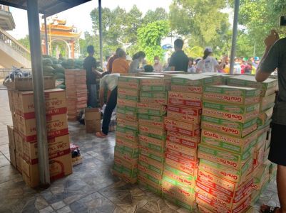 Mỗi phần quà gồm 10kg gạo, thùng mì, nước tương, trị giá 200.000đ/ phần. Tổng số tiền là 120 triệu đồng.