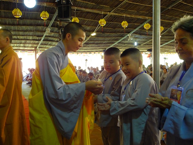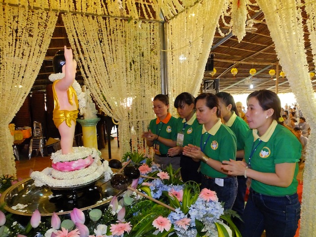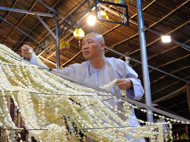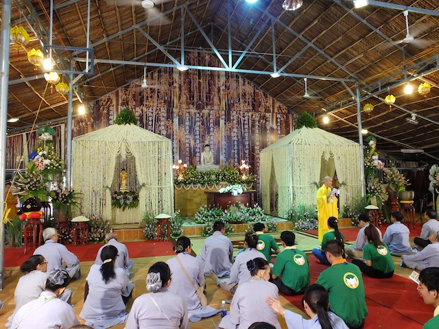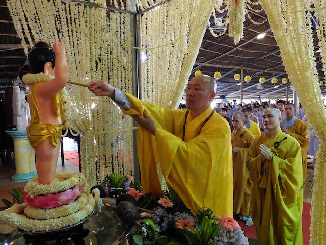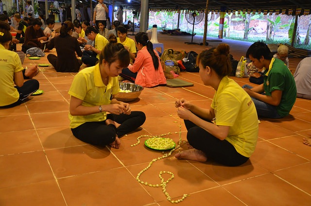 Gần 200 Phật tử vân tập về chùa trước ngày Huân tu để phụ giúp quý Thầy trang trí, chuẩn bị lễ tắm Phật. Dù vất vả thức suốt đêm để kịp kết hoa lài, cắm hoa lễ đài, sắp xếp vật dụng cần thiết trong chánh điện, những tiếng cười khúc khích thi thoảng khuấy động chánh điện xoá tan cơn buồn ngủ và để lại nhiều kỷ niệm trong huynh đệ cùng nhau công quả nơi đây.