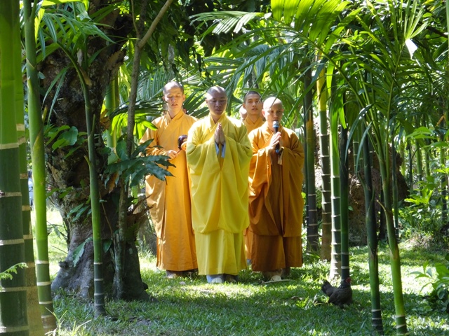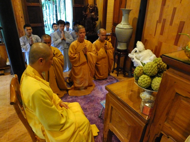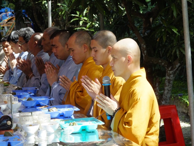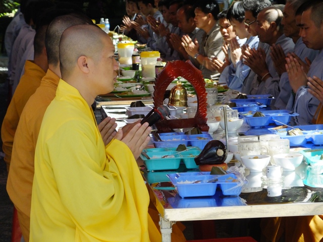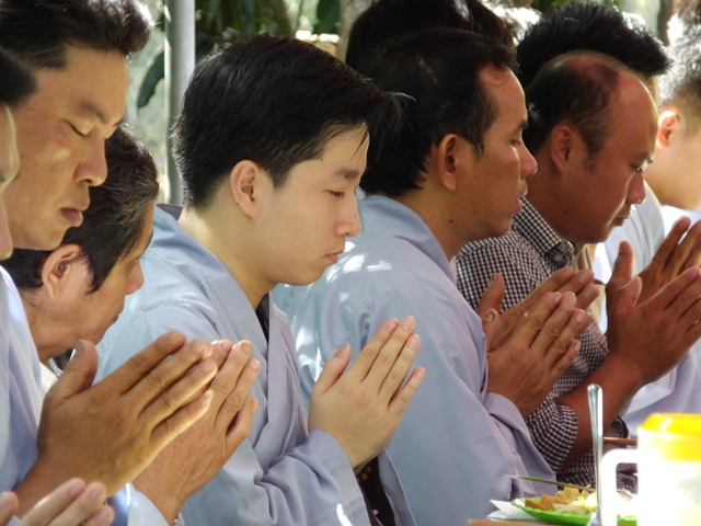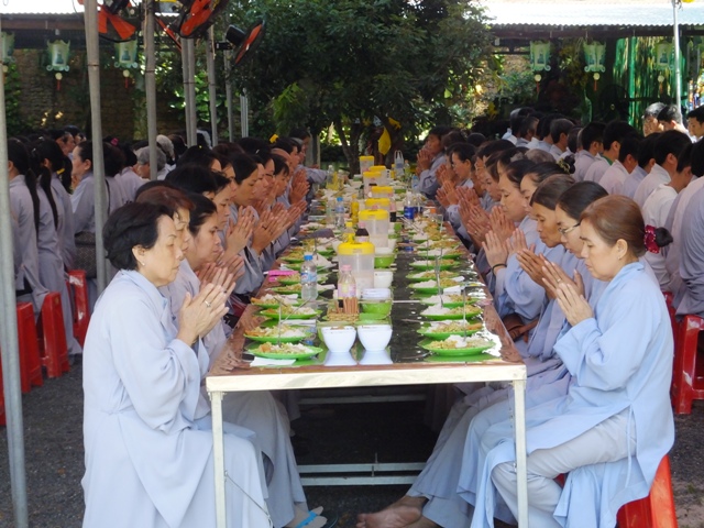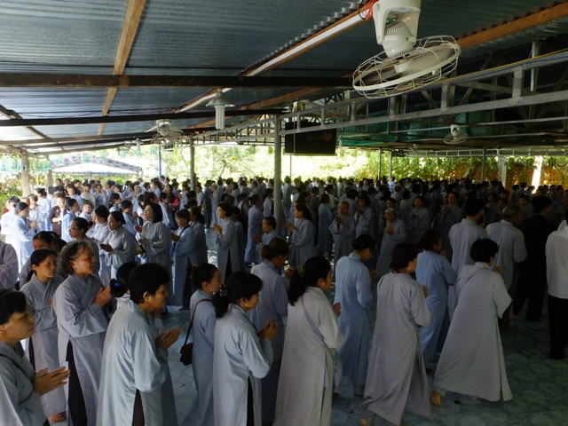 Sau thời pháp thoại, đạo tràng cùng trang nghiêm chấp tay lắng nghe ĐĐ. Thích Thiện Thuận tuyên đọc Kinh Đại Bát Niết Bàn – phẩm 4 – Trường Thọ. Tiếp theo, hành giả tham gia khóa lạy Kinh Vạn Phật trước khi dùng cơm quá đường và kinh hành niệm Phật.