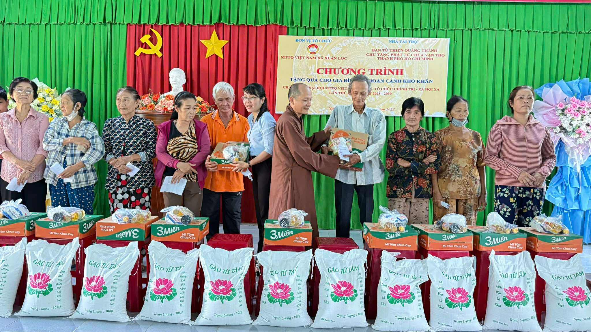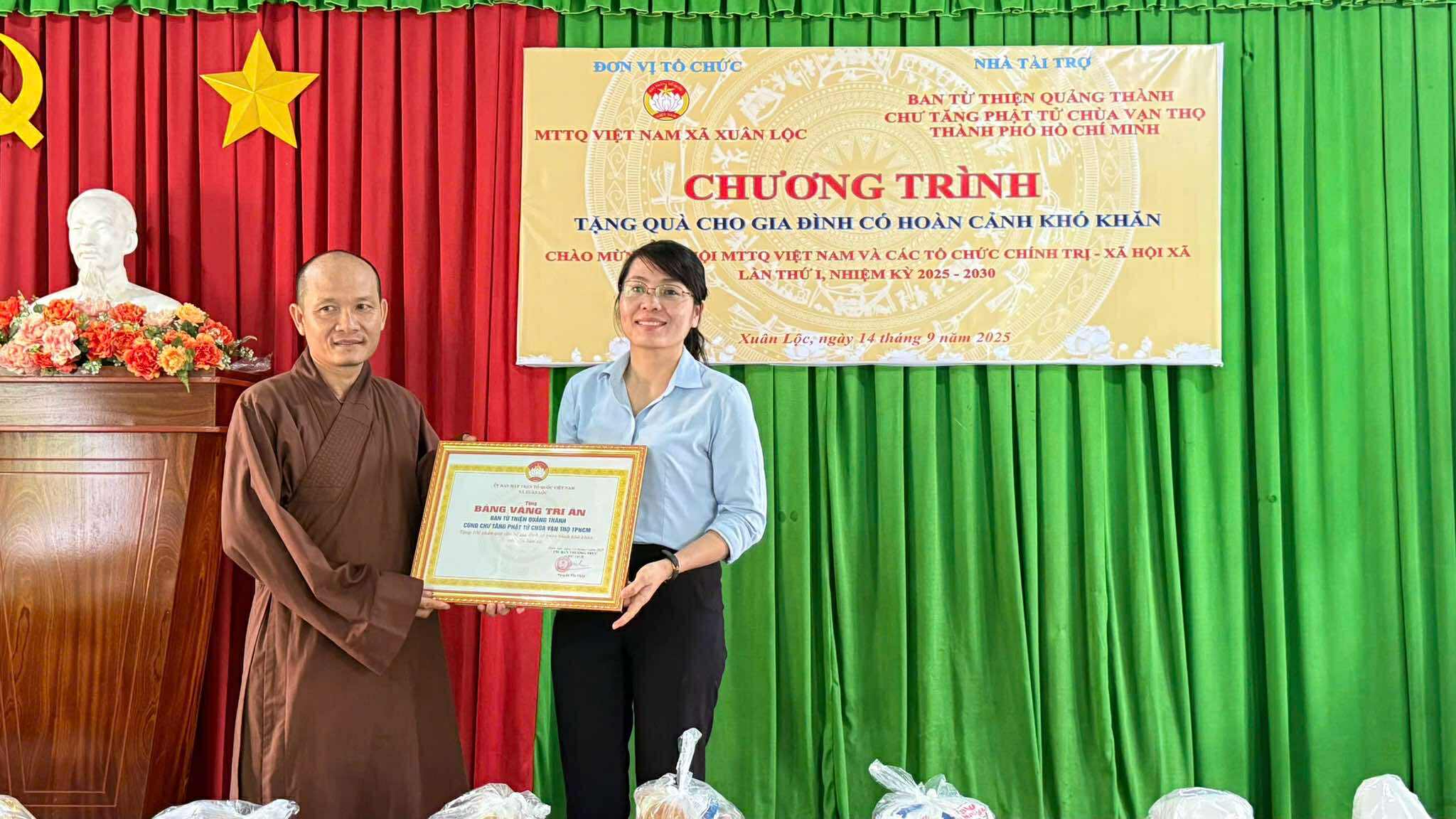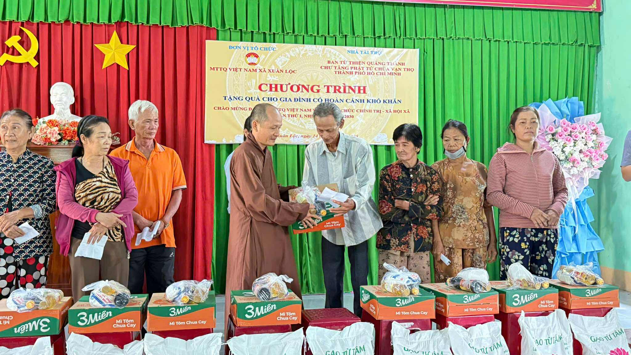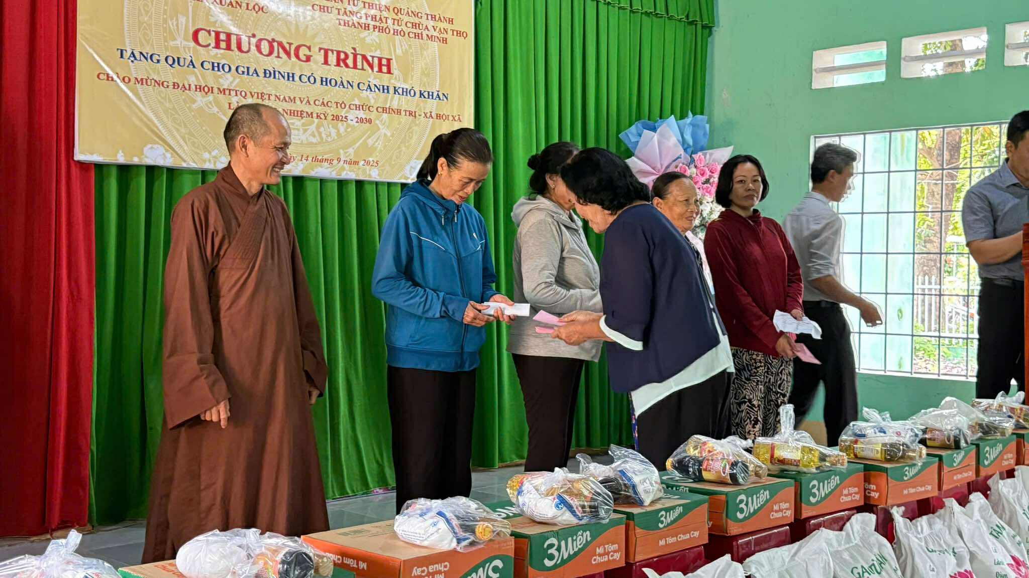 Sáng ngày 14-9-2025, Ban Từ thiện Quảng Thành cùng chư Tăng Tổ đình Chùa Vạn Thọ đã phối hợp với Ủy ban MTTQ xã Xuân Lộc, tỉnh Đồng Nai, tổ chức chương trình trao quà từ thiện đến các hộ gia đình có hoàn cảnh khó khăn tại địa phương.