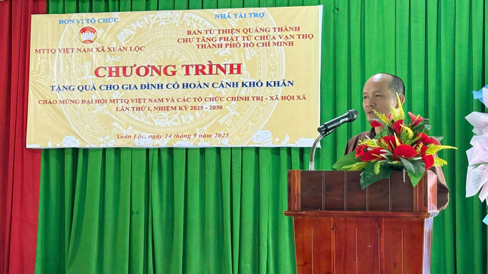 Đại diện UBMTTQ xã Xuân Lộc đã phát biểu bày tỏ lòng tri ân sâu sắc đến chư Tăng Tổ đình Chùa Vạn Thọ, Ban Từ thiện Quảng Thành và quý Phật tử gần xa đã đồng hành cùng địa phương trong công tác an sinh xã hội.