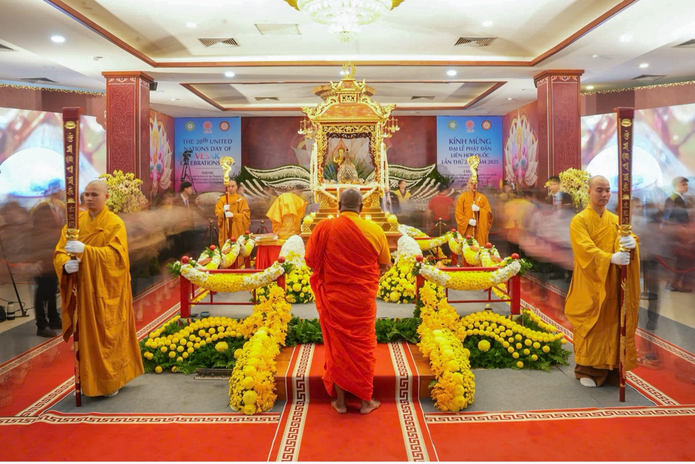Bên trong Hội trường chính nơi tôn trí Xá lợi Đức Phật, không khí linh thiêng và thành kính, người dân đi nhiễu xung quanh Xá lợi Đức Phật.