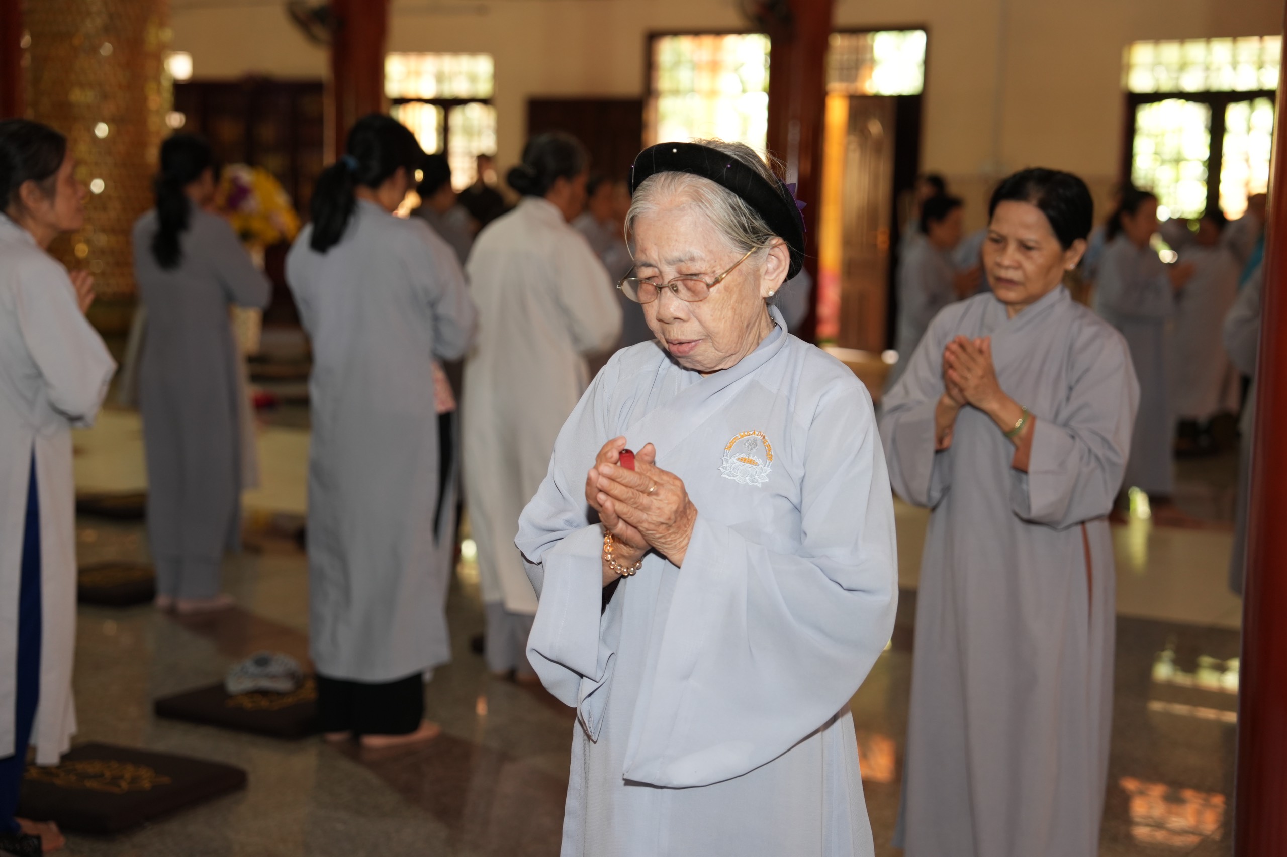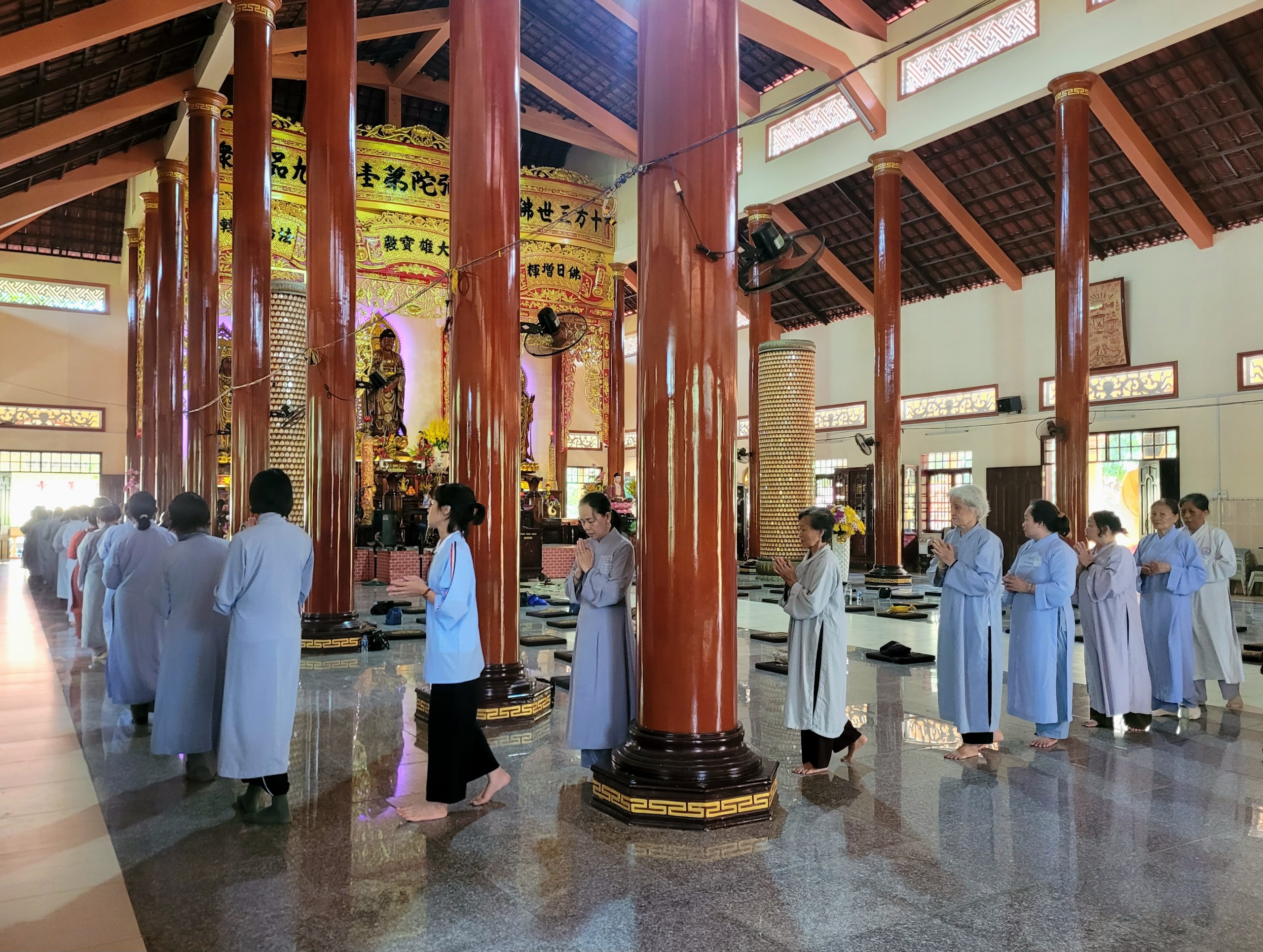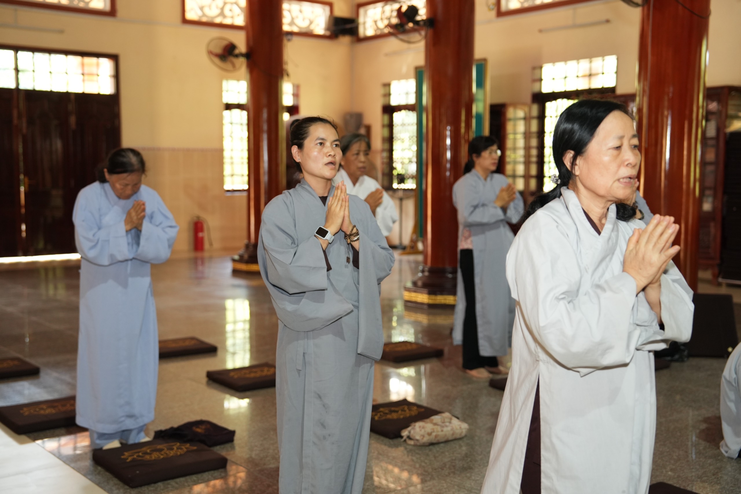 Thời khoá buổi sáng, đại chúng cộng tu niệm Phật, lạy hồng danh đức Phật A Di Đà, kinh hành, dùng cơm chánh niệm.