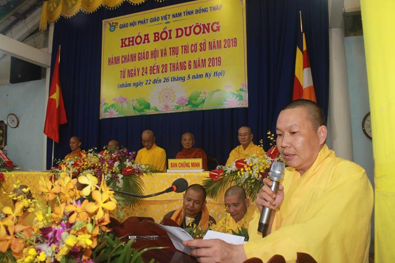 Buổi lễ được nghe phần báo cáo tổng kết do, Đại đức Thích Chơn Tâm, Chánh Thư ký BTS Phật giáo tỉnh; khóa học đã cung thỉnh Chư tôn hòa Thượng trong Ban chứng minh, chứng minh của khóa học; được diễn ra 05 ngày, từ ngày 24 đến 28/6/2019 tại chùa Phước Hưng, Phường 1, Thành Phố Sa Đéc, với số lượng 315 học viên tham dự.