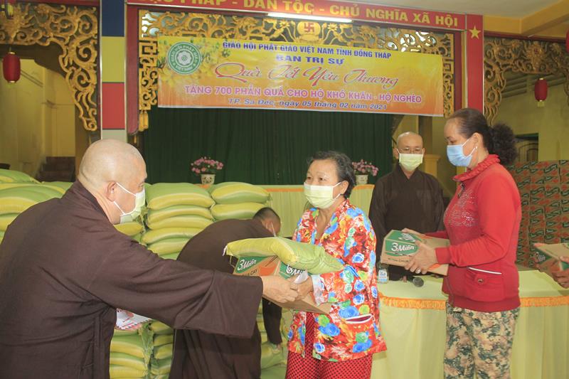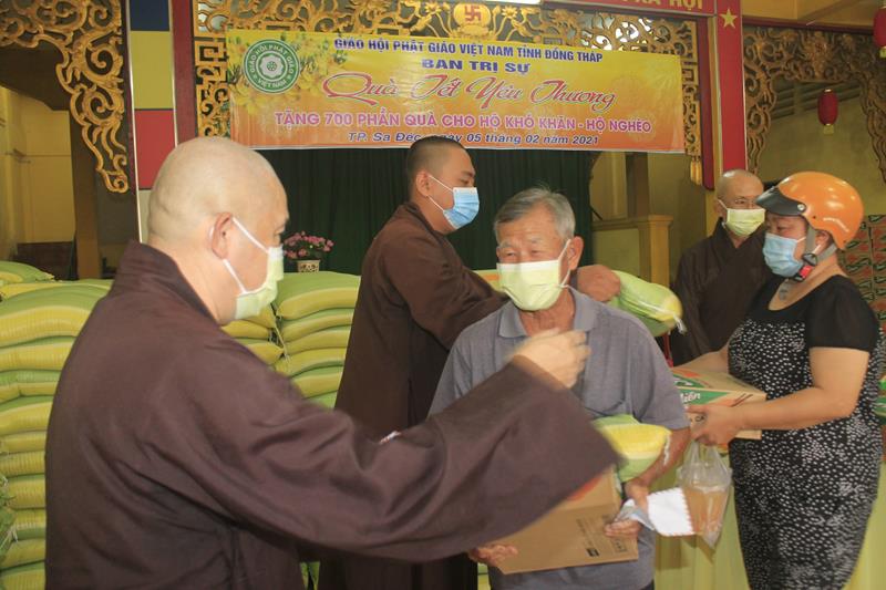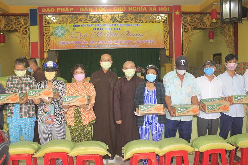 Hướng tới Tết Nguyên đán Tân Sửu 2021, BTS Phật giáo tỉnh Đồng Tháp đã triển khai nhiều hoạt động ý nghĩa vì người nghèo, giúp họ vượt qua khó khăn, đón Tết đầm ấm, an vui. Vào sáng ngày 05/02/2021, Phật giáo tỉnh Đồng Tháp đã tổ chức tặng 700 phần quà cho hộ khó khăn, hộ nghèo tại Văn phòng Ban Trị sự – chùa Bửu Quang (phường 01, TP. Sa Đéc), đồng thời gửi tặng 100 phần quà đến cán bộ biên phòng các tuyến biên giới thuộc tỉnh Đồng Tháp đang làm nhiệm vụ chốt chặn biên giới phòng chống Covid-19.