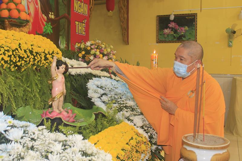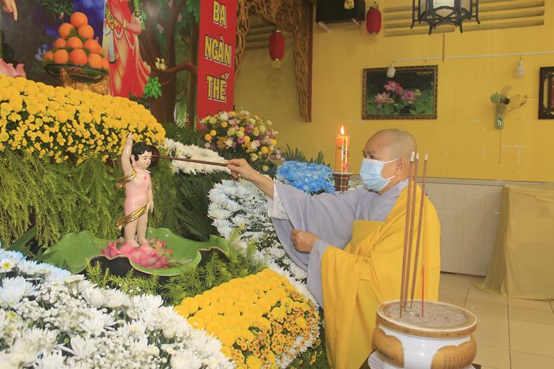 Trước tình hình xã hội đang ở trong giai đoạn tăng cường phòng chống dịch Covid-19, Ban Tổ chức đã rút gọn phần tham dự lễ Tắm Phật, giới hạn số lượng, chư tôn đức tham dự được kiểm tra thân nhiệt, rửa tay sát khuẩn, đeo khẩu trang theo quy định.