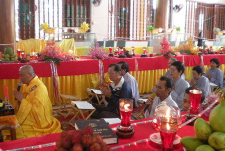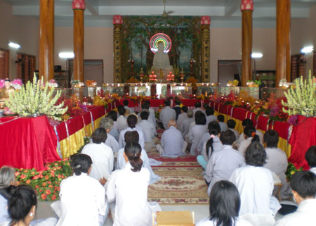 Thầy Thích Quảng Nghiêm bắt đầu làm lễ, các Phật tử tập trung vào chính điện để đọc kinh Đại Bát Niết Bàn cùng thầy. Do tôi không thích đọc kinh, cứ mỗi khi phải ngồi đọc kinh là tôi cảm thấy buồn chán ghê gớm nên tôi nghĩ bụng sau khi chụp hình xong, tôi sẽ qua ngôi cổ tự, lúc này chắc hẳn là yên tĩnh lắm vì chẳng có ai, để ngồi thiền.