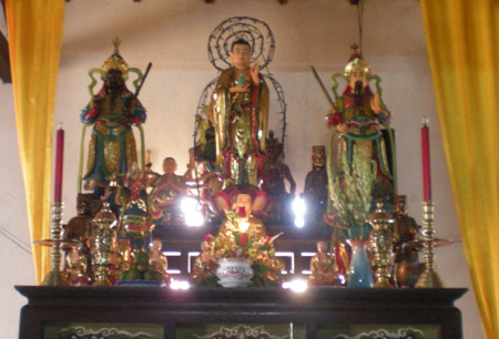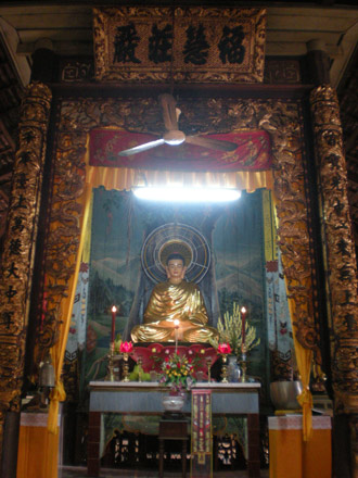 Nghĩ là làm, sau khi hoàn thành nhiệm vụ chụp hình, tôi lẻn qua ngôi cổ tự. Ngôi chủa nhỏ chỉ có hai gian, một gian thờ tổ và một gian thờ Phật. Do không thắp đủ đèn nên trong chính điện khá tối, bên trong yên lặng như tờ. Chùa cổ nên đẹp tuyệt, các cây cột bằng gỗ quý to gần bằng một ôm tay đen bóng, chính điện thếp vàng lộng lẫy, tượng Phật Thich Ca và A Di Đà và các Bồ tát sơn son với vẽ mặt hết sức từ bi.
