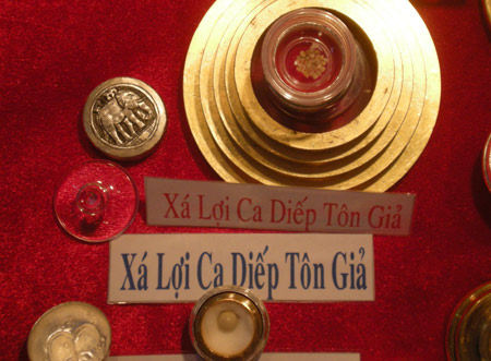 Xá lợi của Phật và các thánh tăng như Xá Lợi Phất, Mục Kiền Liên, Ca Diếp Tôn Giả và Savaly Tôn Giả được trưng bày trang nghiêm trong các tháp đặt trong các tủ kính để tại gian chính điện mới xây. Bày quanh các tủ kính là các giỏ hoa các loại và đèn ly thắp sáng để cúng dường.
