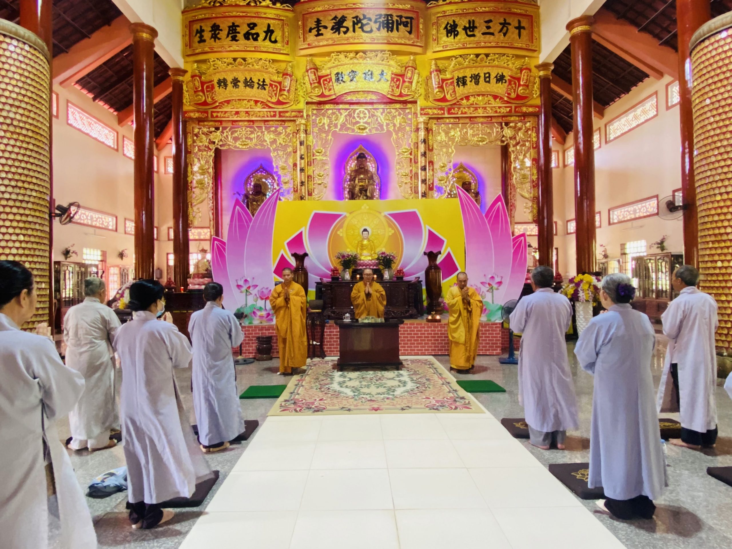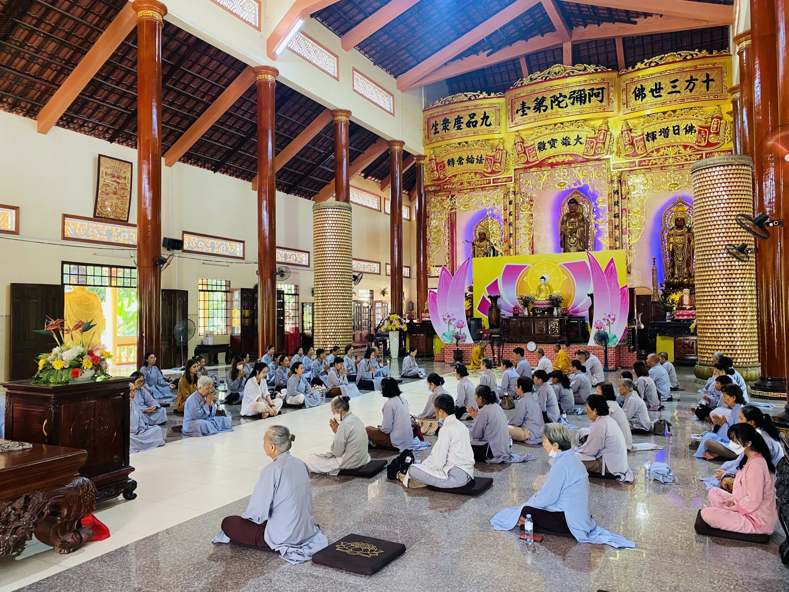 Theo đó, chư Phật tử được hướng dẫn dùng sáng, sau đó y phục, áo giới chỉnh tề quang lâm điện Phật hành trì pháp môn niệm Phật.