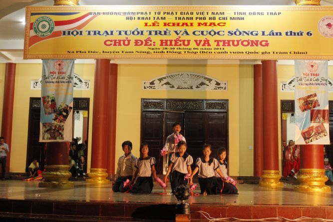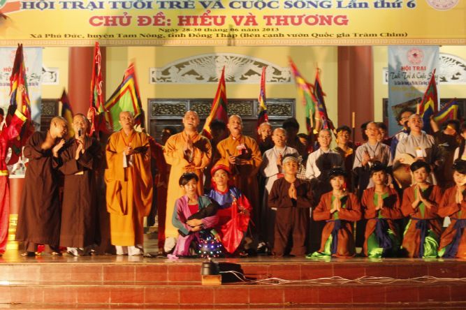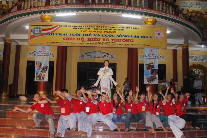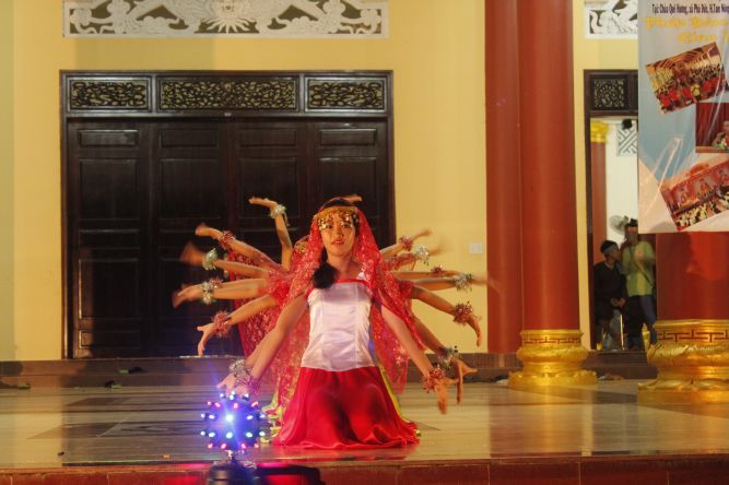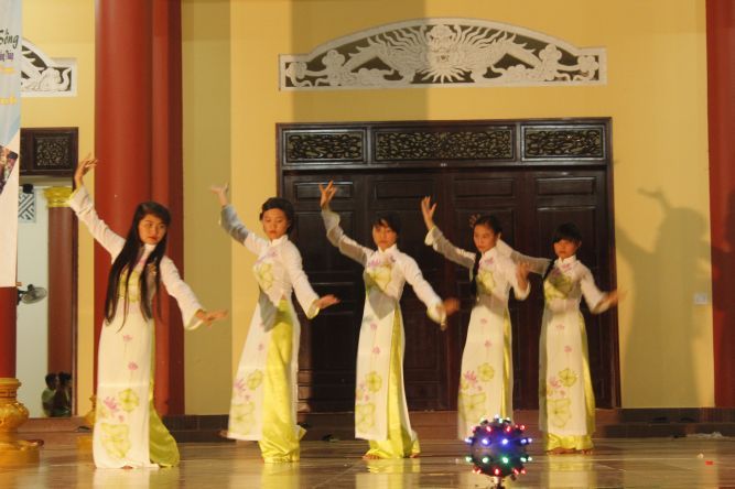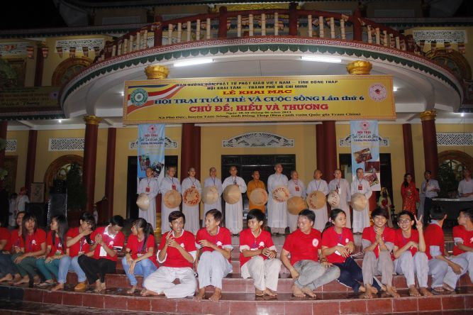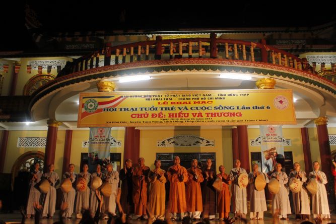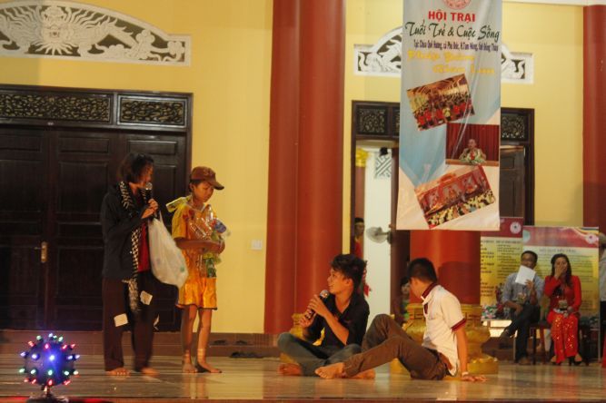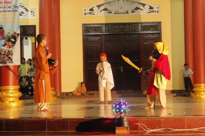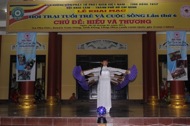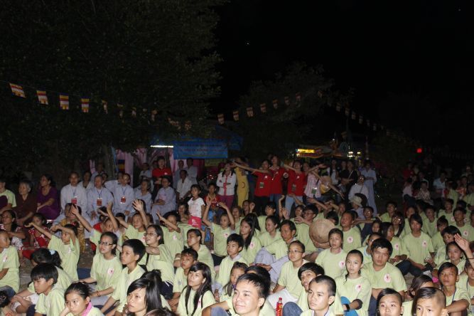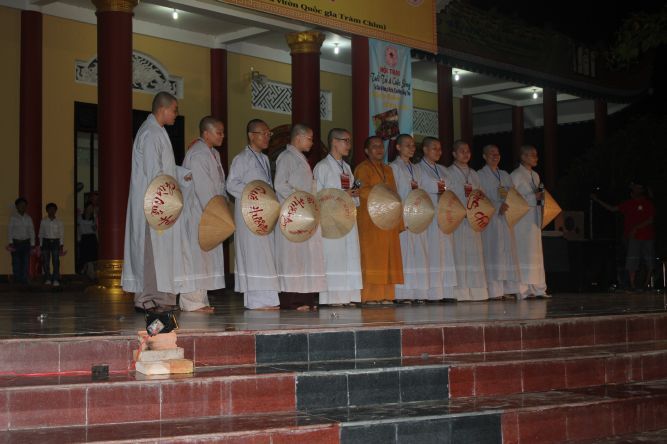 Mở đầu chương trình là tiết mục Múa hiện đại của Tiểu trại Bảo An. Các trại sinh nhí thân thương thường ngày giản dị trong màu áo xanh đồng phục Hội trại, đêm nay hát rất hay, nhảy múa rất đẹp và rạng rỡ tươi mới vô cùng. Những tiết mục đặc sắc nhất có thể kể đến là hoạt cảnh “Hòn Vọng Phu” của trại Tu viện Linh Thứu, hoạt cảnh “Hồi hướng quay đầu”, Độc tấu Harmonica “Ánh trăng nói hộ lòng tôi” của tiếu trại Bửu Nghiêm… Các anh chị TNV trong tà áo dài Việt Nam duyên dáng cũng cúng dường lên Tam Bảo tiết mục múa “Đêm pháp hoa”. Sau hơn 2 giờ đồng hồ rộn rã với những khúc nhạc, lời ca điệu múa, liên khúc “Hiểu và Thương” – “Hoằng Pháp Trẻ dấn thân phục vụ vì chúng sanh” – bài hát “Niềm An Vui” do quý thầy cô trong Ban Điều Phối Hội trại trình bày đã khép lại đêm văn nghệ thật viên mãn.