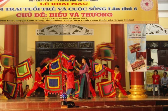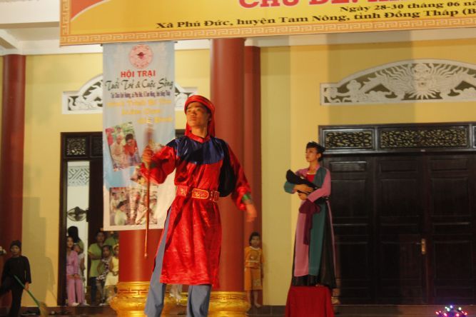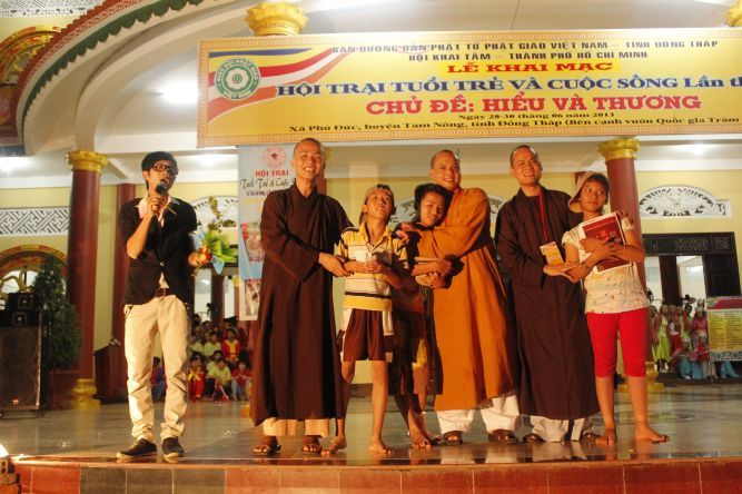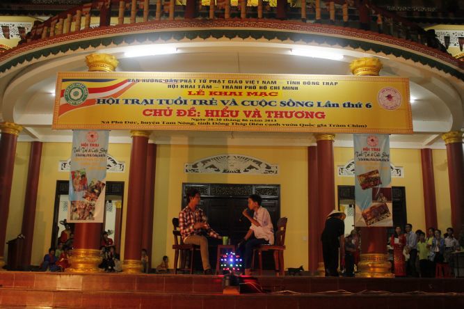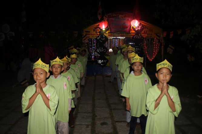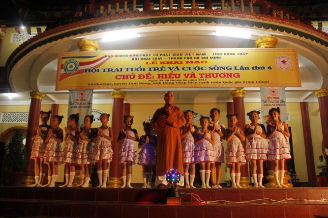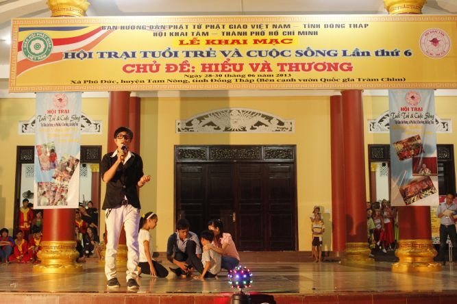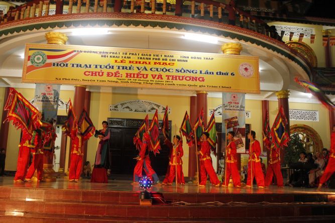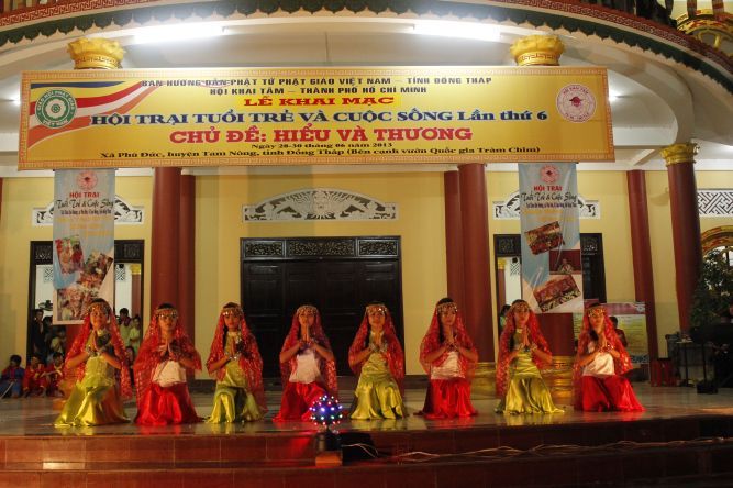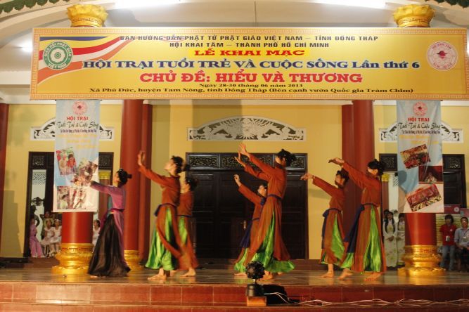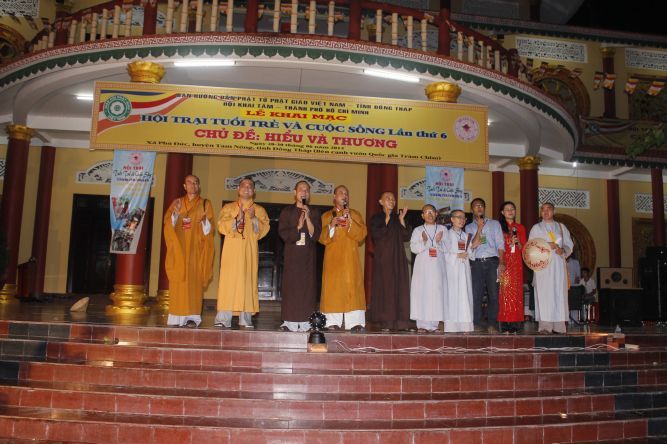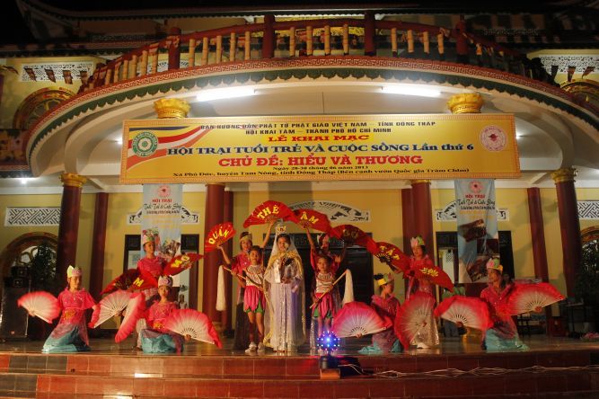 Mở đầu chương trình là tiết mục Múa hiện đại của Tiểu trại Bảo An. Các trại sinh nhí thân thương thường ngày giản dị trong màu áo xanh đồng phục Hội trại, đêm nay hát rất hay, nhảy múa rất đẹp và rạng rỡ tươi mới vô cùng. Những tiết mục đặc sắc nhất có thể kể đến là hoạt cảnh “Hòn Vọng Phu” của trại Tu viện Linh Thứu, hoạt cảnh “Hồi hướng quay đầu”, Độc tấu Harmonica “Ánh trăng nói hộ lòng tôi” của tiếu trại Bửu Nghiêm… Các anh chị TNV trong tà áo dài Việt Nam duyên dáng cũng cúng dường lên Tam Bảo tiết mục múa “Đêm pháp hoa”. Sau hơn 2 giờ đồng hồ rộn rã với những khúc nhạc, lời ca điệu múa, liên khúc “Hiểu và Thương” – “Hoằng Pháp Trẻ dấn thân phục vụ vì chúng sanh” – bài hát “Niềm An Vui” do quý thầy cô trong Ban Điều Phối Hội trại trình bày đã khép lại đêm văn nghệ thật viên mãn.