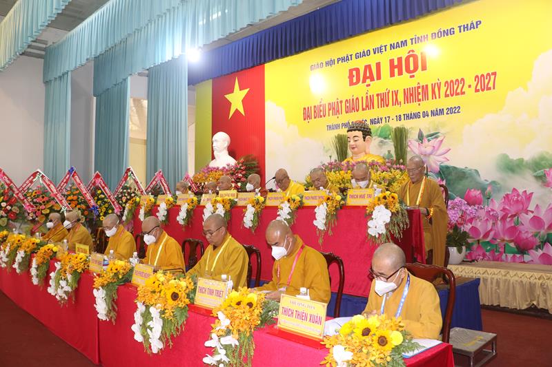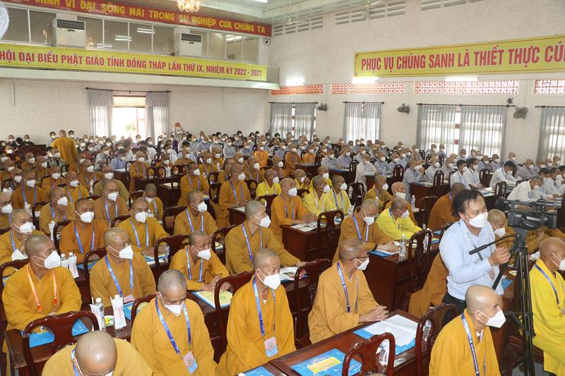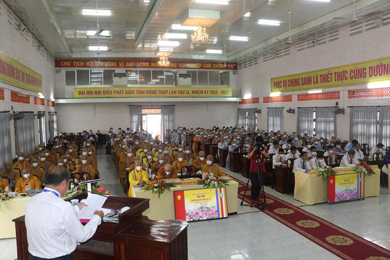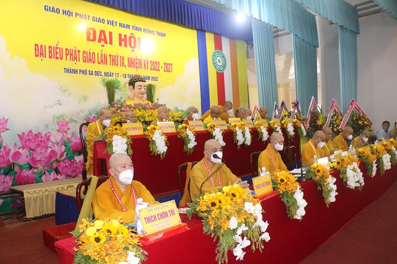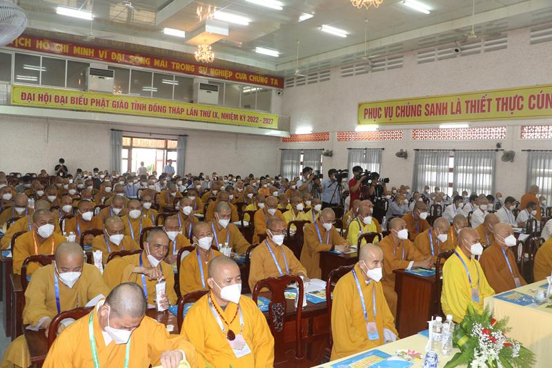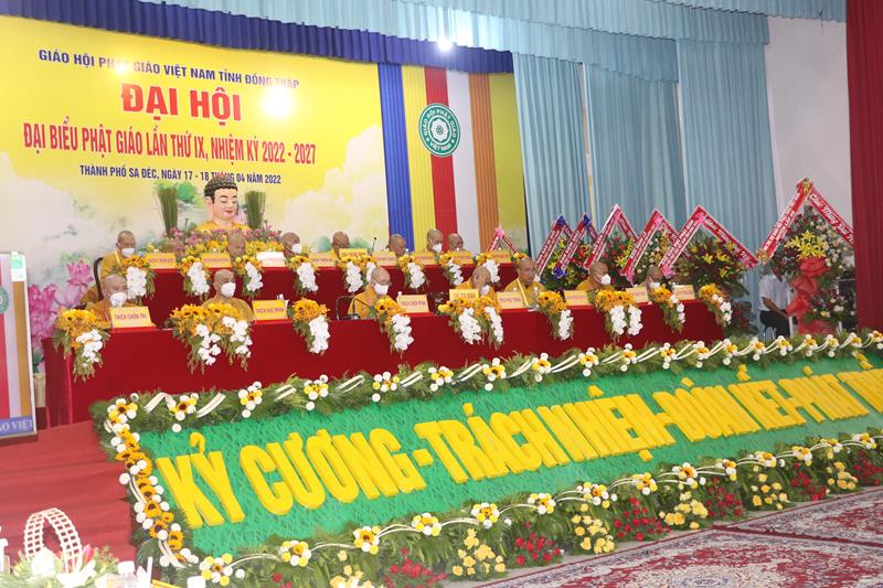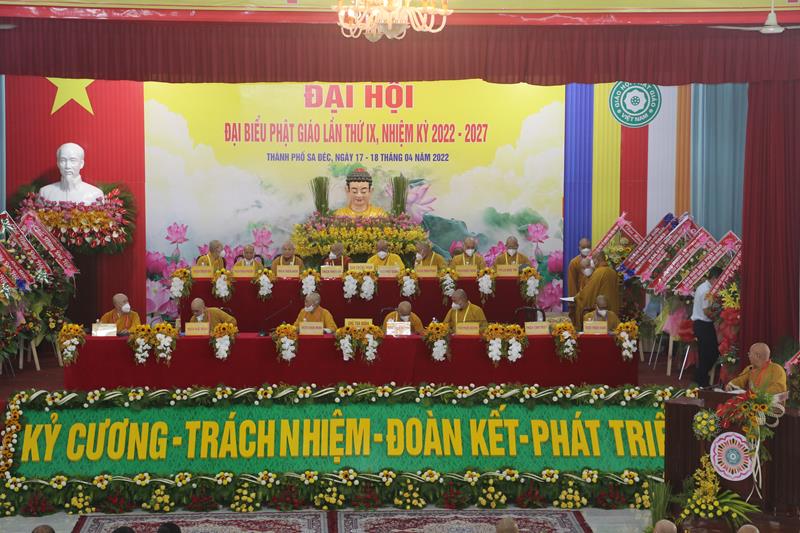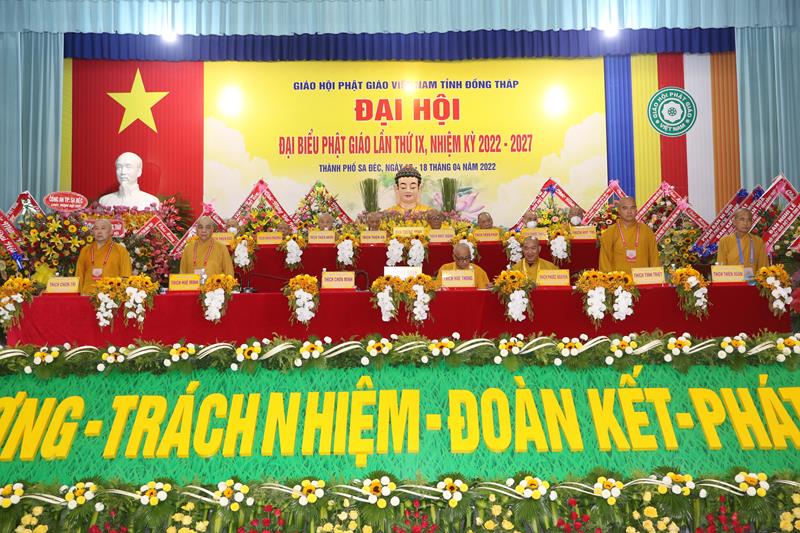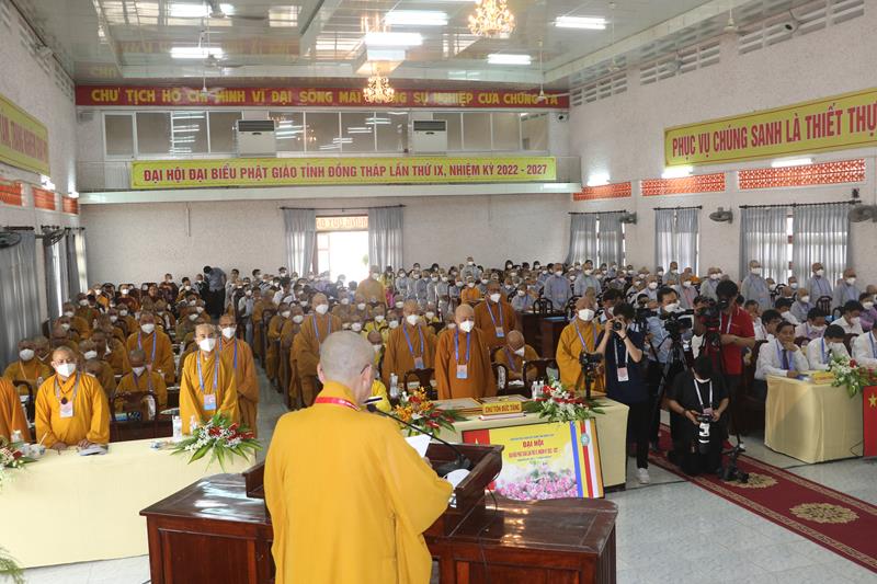 Song song đó, Đại hội cũng suy cử những Tăng Ni, Phật tử đủ năng lực, đạo đức tham gia vào Ban Trị sự nhiệm kỳ mới để trực tiếp đảm nhiệm trọng trách điều hành công tác Phật sự tại tỉnh nhà. Với tin thần đoàn kết, hòa hợp của Tăng Ni, Phật tử tỉnh nhà, chúng tôi tin tưởng rằng Đại hội sẽ thành công tốt đẹp. Trong tinh thần đoàn kết hòa hợp, dưới sự chứng minh của Chư tôn đức Tăng Ni, các cấp chính quyền và toàn thể Phật tử có mặt hôm nay, với chủ đề “KỶ CƯƠNG – TRÁCH NHIỆM – ĐOÀN KẾT- PHÁT TRIỂN”, Đại hội Đại biểu Phật giáo tỉnh Đồng Tháp lần thứ IX nhiệm kỳ 2022-2027.
