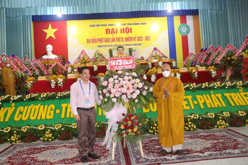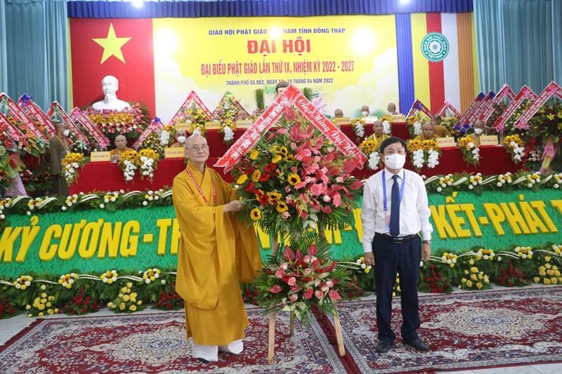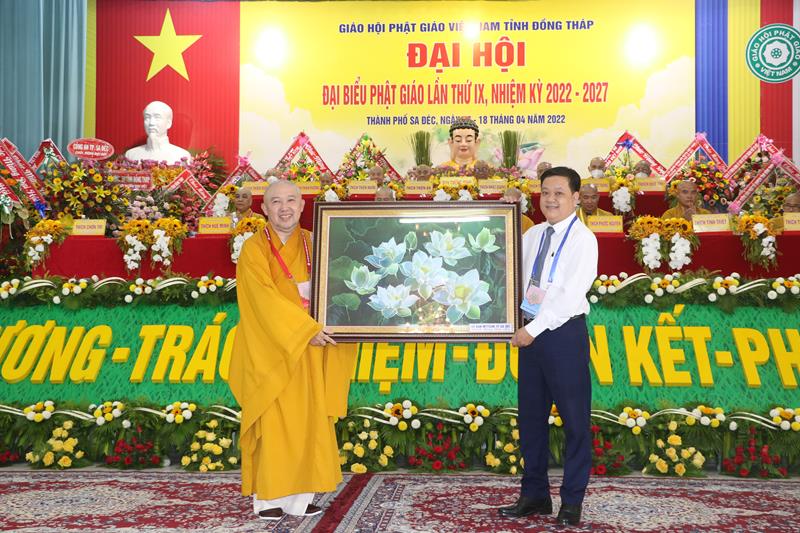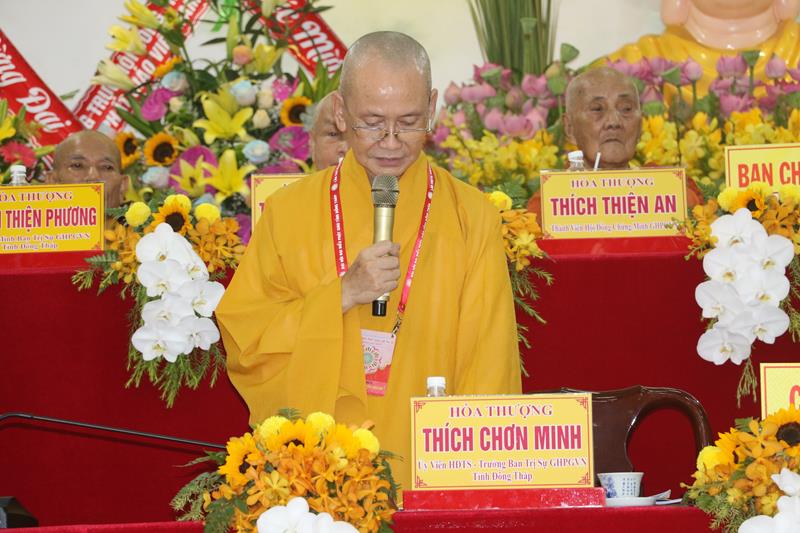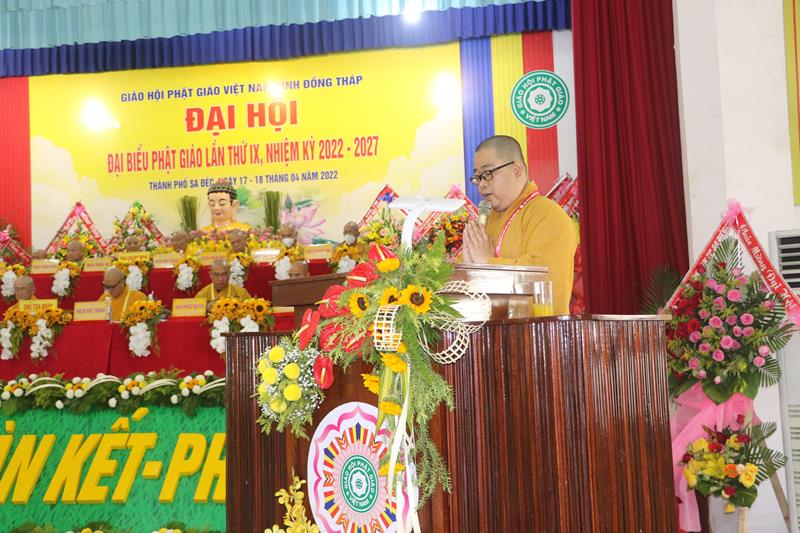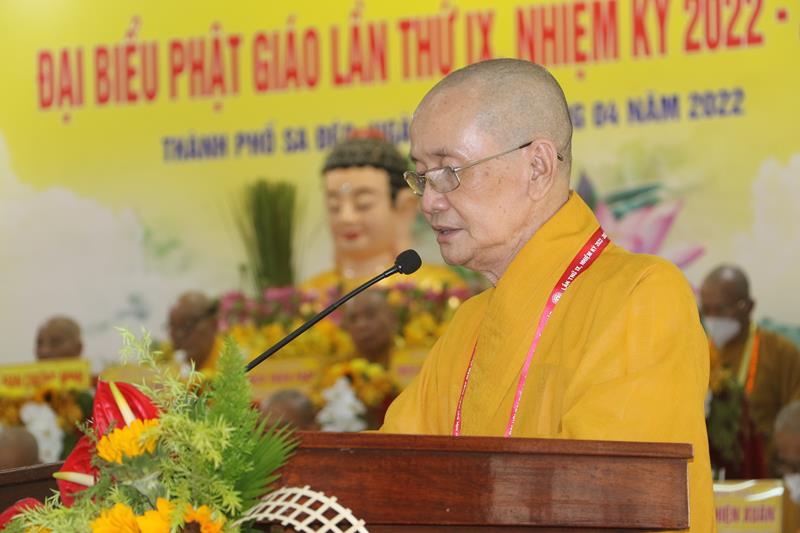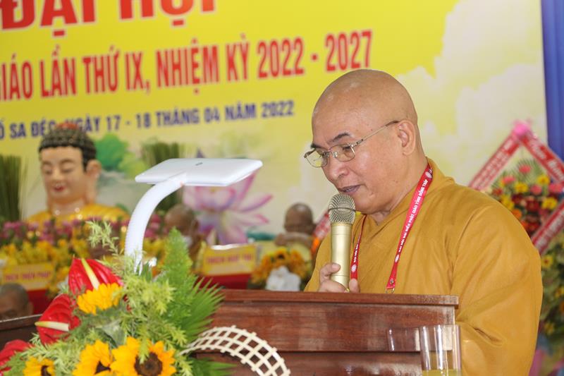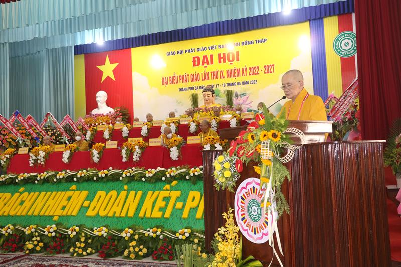 Phát biểu tại Đại hội, HT.Thích Thiện Nhơn – Chủ tịch HĐTS GHPGVN ngoài việc biểu dương và đánh giá cao những thành tựu Phật sự của của Ban Trị sự Phật giáo tỉnh Đồng Tháp đã làm được trong thời gian qua. Ban Trị sự GHPGVN tỉnh Đồng Tháp nhiệm kỳ 2022-2027 với cơ cấu nhân sự được trẻ hóa, tân Ban Trị sự sẽ tiếp bước các bậc tiền nhân, gách vác và làm tròn nhiệm vụ, sứ mạng mà Đại hội giao phó, tiếp tục phát huy vai trò lãnh đạo, đoàn kết tập hợp Tăng Ni và Phật tử tỉnh nhà phát huy truyền thống đoàn kết, yêu nước của Phật giáo Việt Nam, sinh hoạt tôn giáo đúng Pháp luật và đường hướng “Đạo pháp, Dân tộc và Chủ nghĩa Xã hội” mà Hiến chương của Giáo hội đã đề ra. Đồng thời, phát huy những giá trị tốt đẹp về văn hóa và đạo đức, bản chất từ bi và trí tuệ của đạo Phật, tích cực trong công tác từ thiện và hoạt động an sinh xã hội, các hoạt động phát triển kinh tế-xã hội, góp phần xây dựng  tỉnh nhà và xây dựng Giáo hội ngày càng vững mạnh, xứng đáng là thành viên tích cực của khối đại đoàn kết toàn dân tộc Việt Nam trong sự nghiệp xây dựng và bảo vệ Tổ quốc trong thời kỳ hội nhập, phát triển.