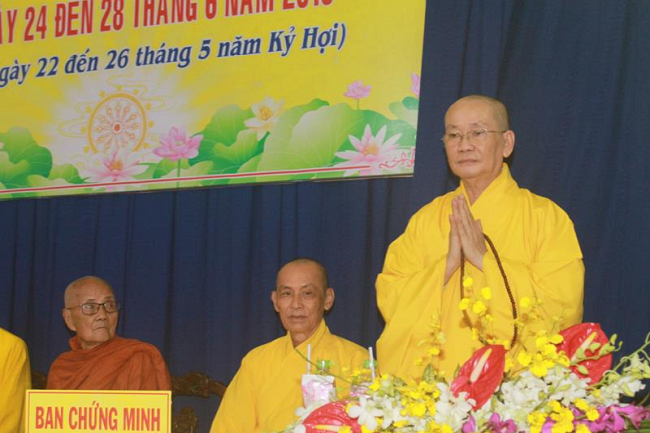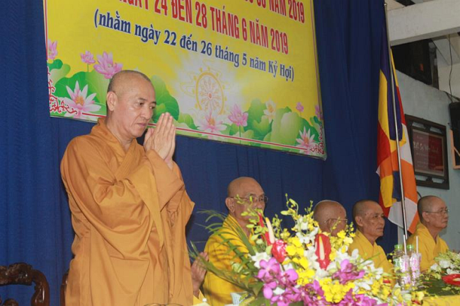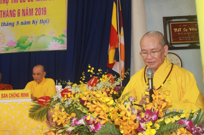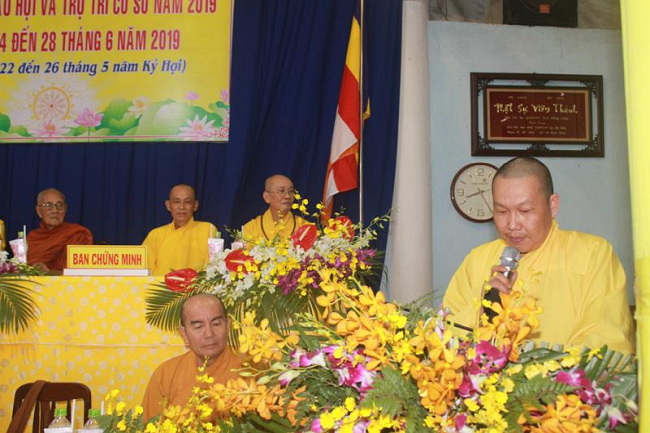 Sau buổi lễ khai mạc, HT. Thích Huệ Thông Thông – Phó Tổng Thư ký kiêm Chánh Văn phòng 2 TƯ GHPGVN, triển khai Hiến chương GHPGVN đến Tăng Ni trong khóa học bồi dưỡng hành chánh giáo hội và trụ trì cơ sở năm 2019.
