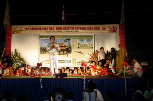 Sau thời pháp thoại sâu sắc ấy là chương trình văn nghệ hoành tráng với sự tham gia của nhiều ca sĩ, nghệ sĩ nổi tiếng như: Lý Hùng, Cát Phượng, Nhật Cường, Nhật Thuận…. Với tấm lòng vị tha, hoan hỷ của đại đức Trụ trì, hàng ngàn người đã kéo về tham dự đêm văn nghệ làm cho ngôi chùa của vùng quê hẻo lánh trở nên chật hẹp.