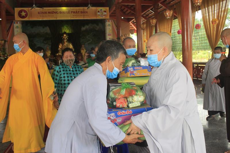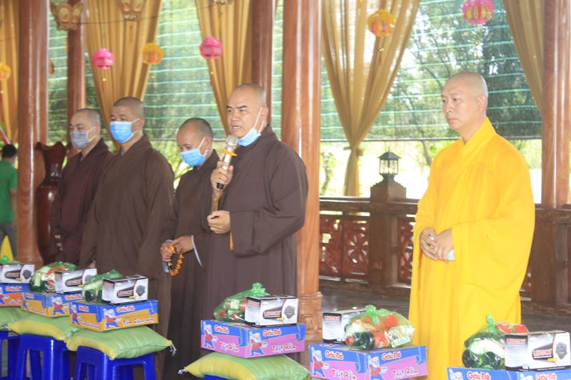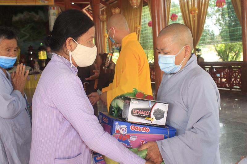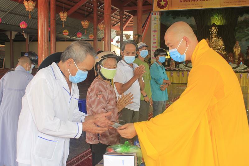 Tiếp đó, dưới sự chứng minh của TT.Thích Tĩnh Triệt và chư tôn đức trong BTS GHPGVN huyện Châu Thành, ĐĐ.Thích Giác Đàn, Sư cô Thích Nữ Giác Bửu và Sư cô Thích Nữ Như Minh đã phát 100 phần quà cho đồng bào nghèo tại địa phương, mỗi phần quà gồm: gạo, mì gói, nhu yếu phẩm và phong bì 500.000 đồng. Tổng chi phí cho lần phát quà này là 70 triệu đồng.