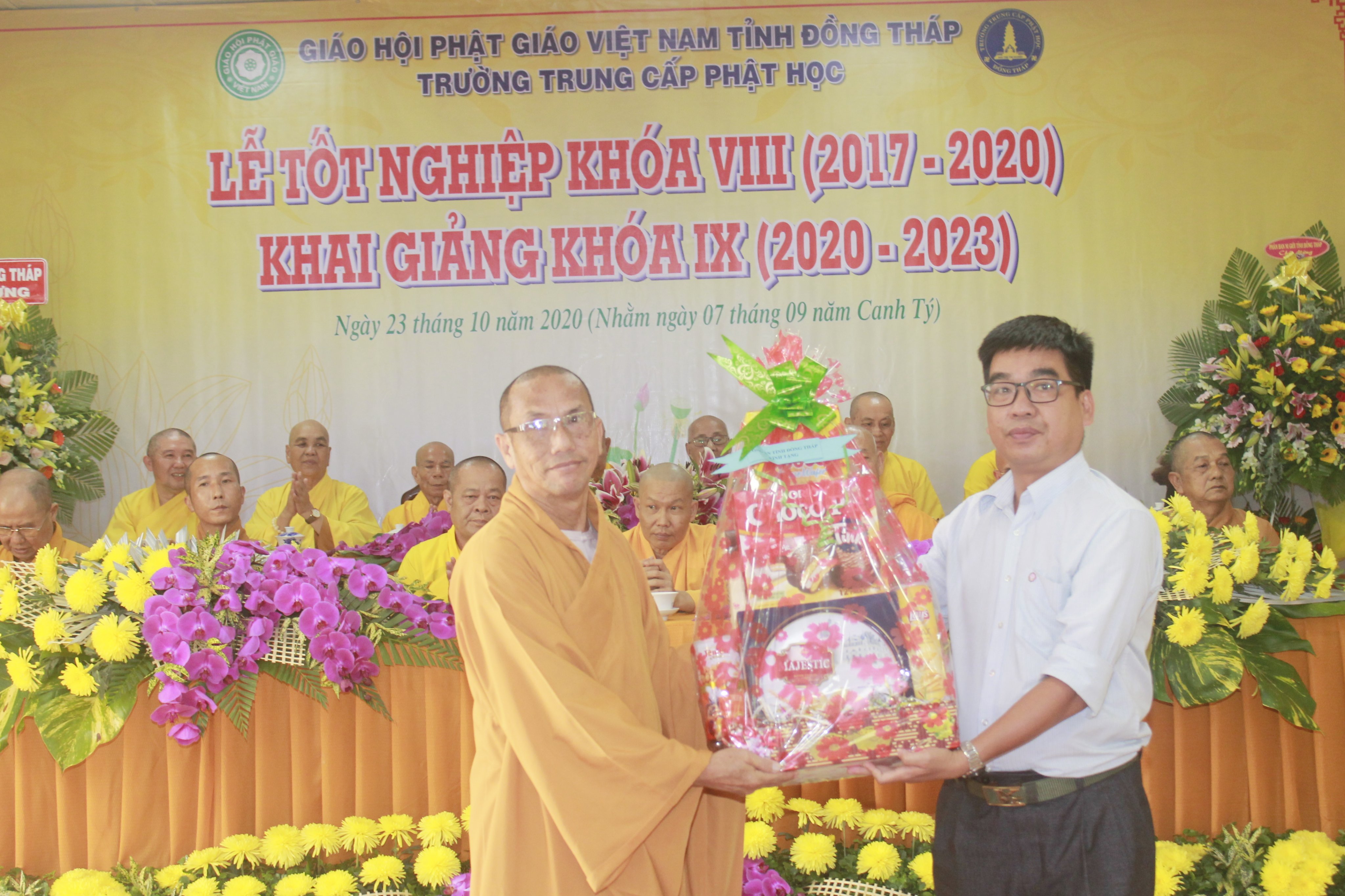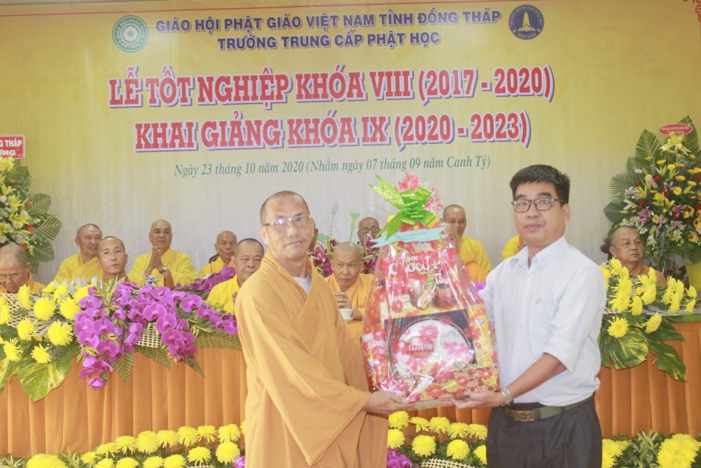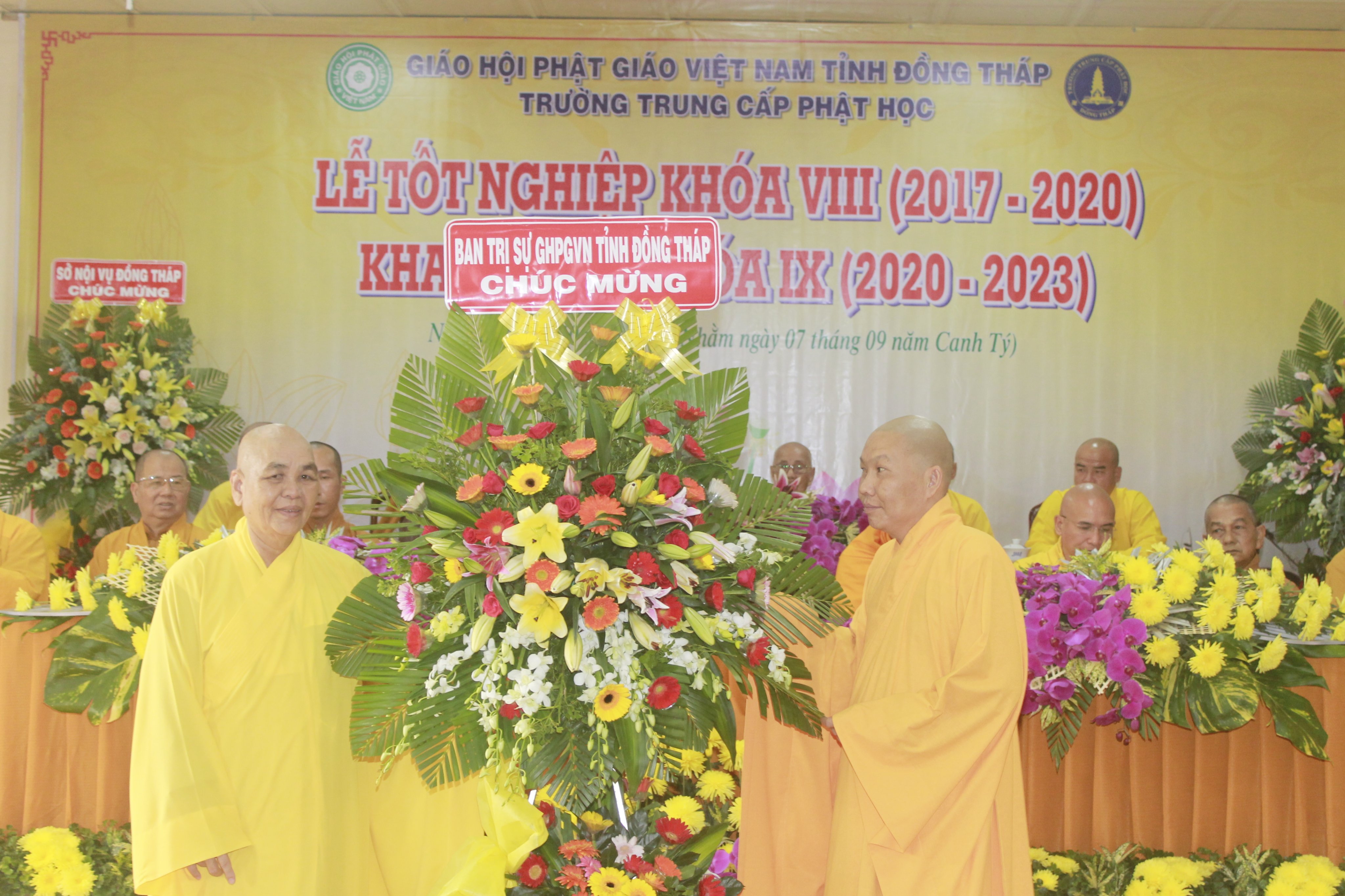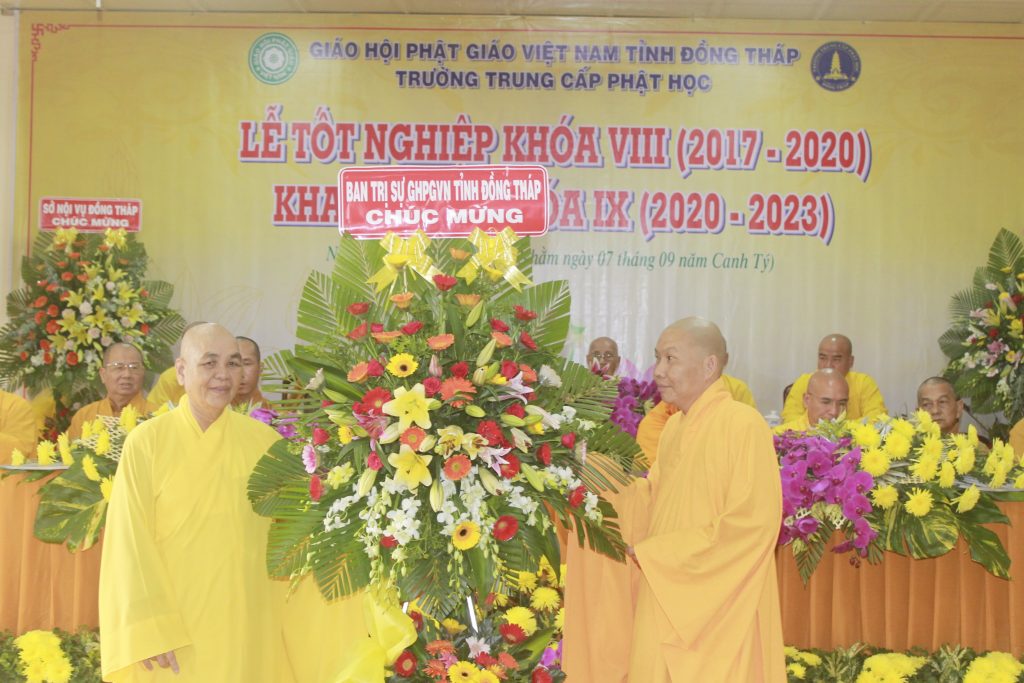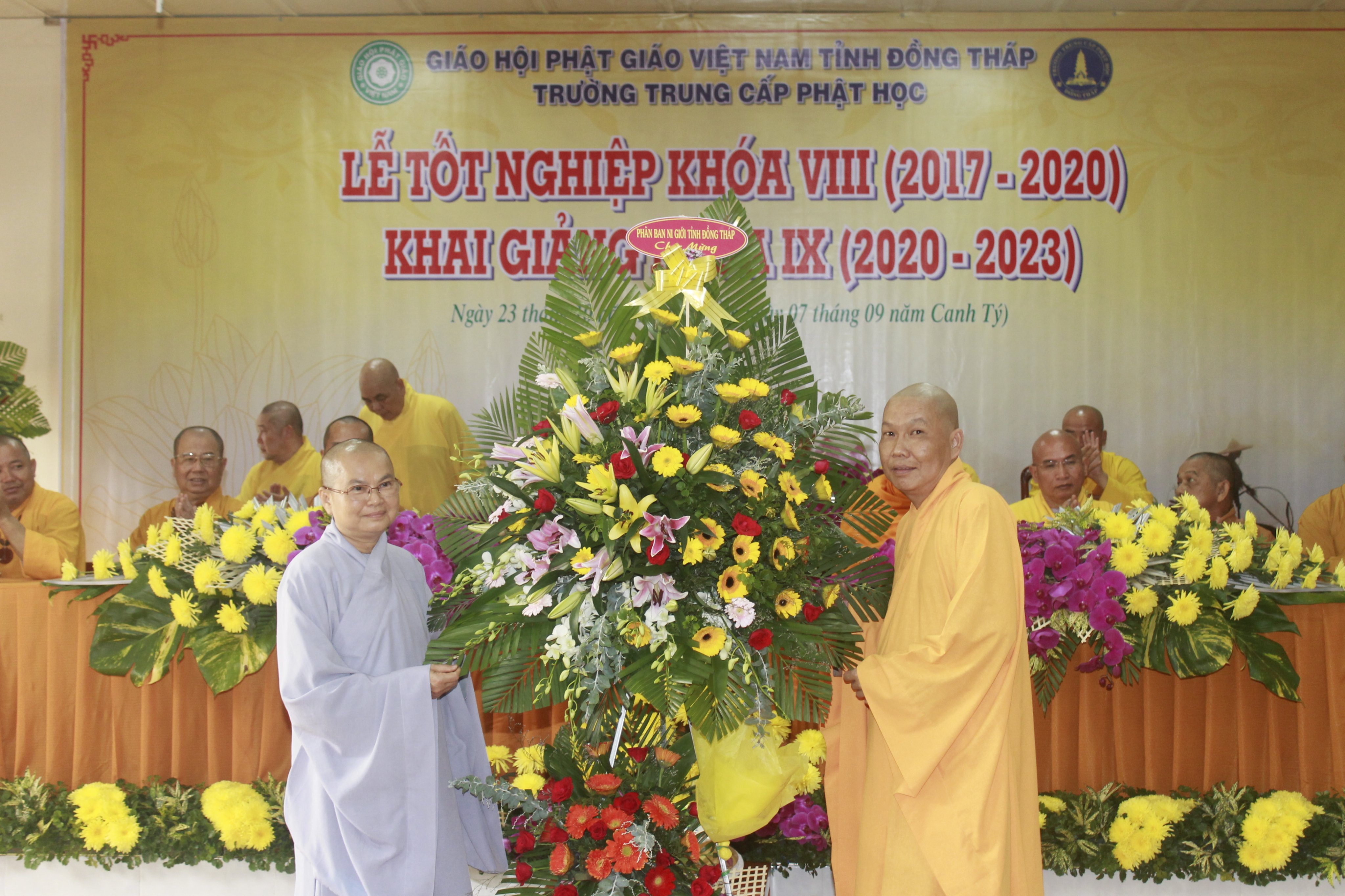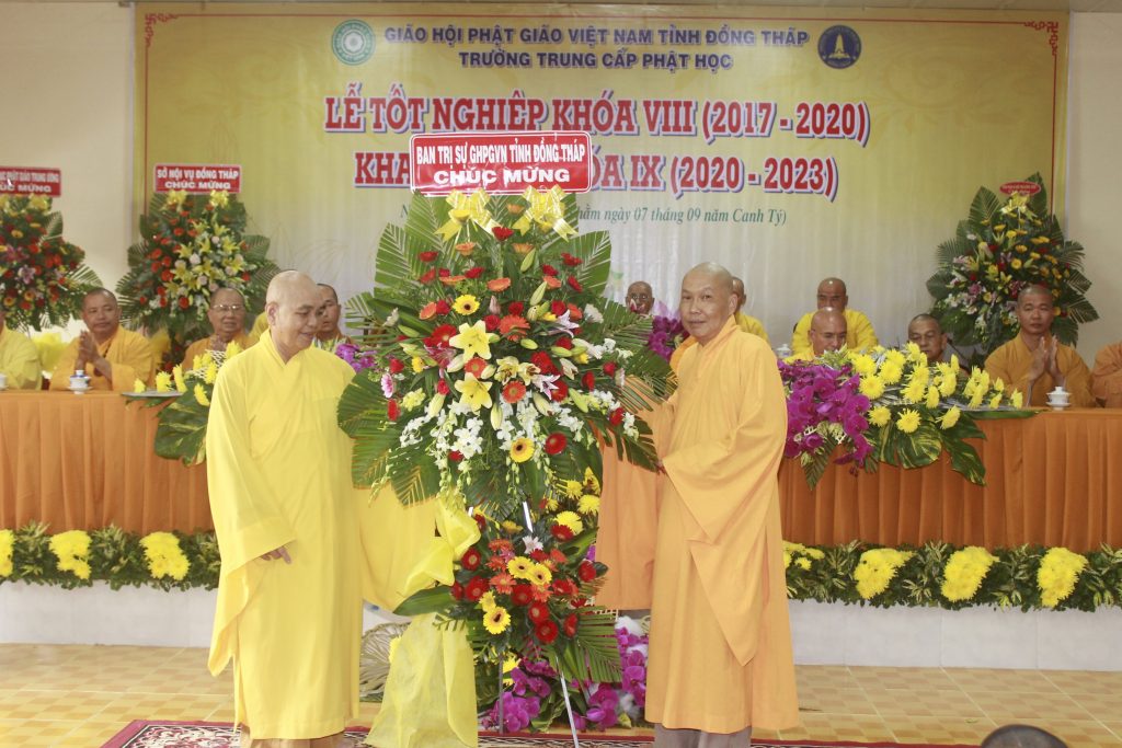 Tại buổi lễ, Ban Tổ chức, Ban Giám hiệu trường đã đón nhận nhiều lẵng hoa tươi thắm và phần quà chúc mừng từ chư Tôn đức Ban chứng minh, Ban trị sự GHPGVN tỉnh Đồng Tháp, các cấp chính quyền đến tham dự.