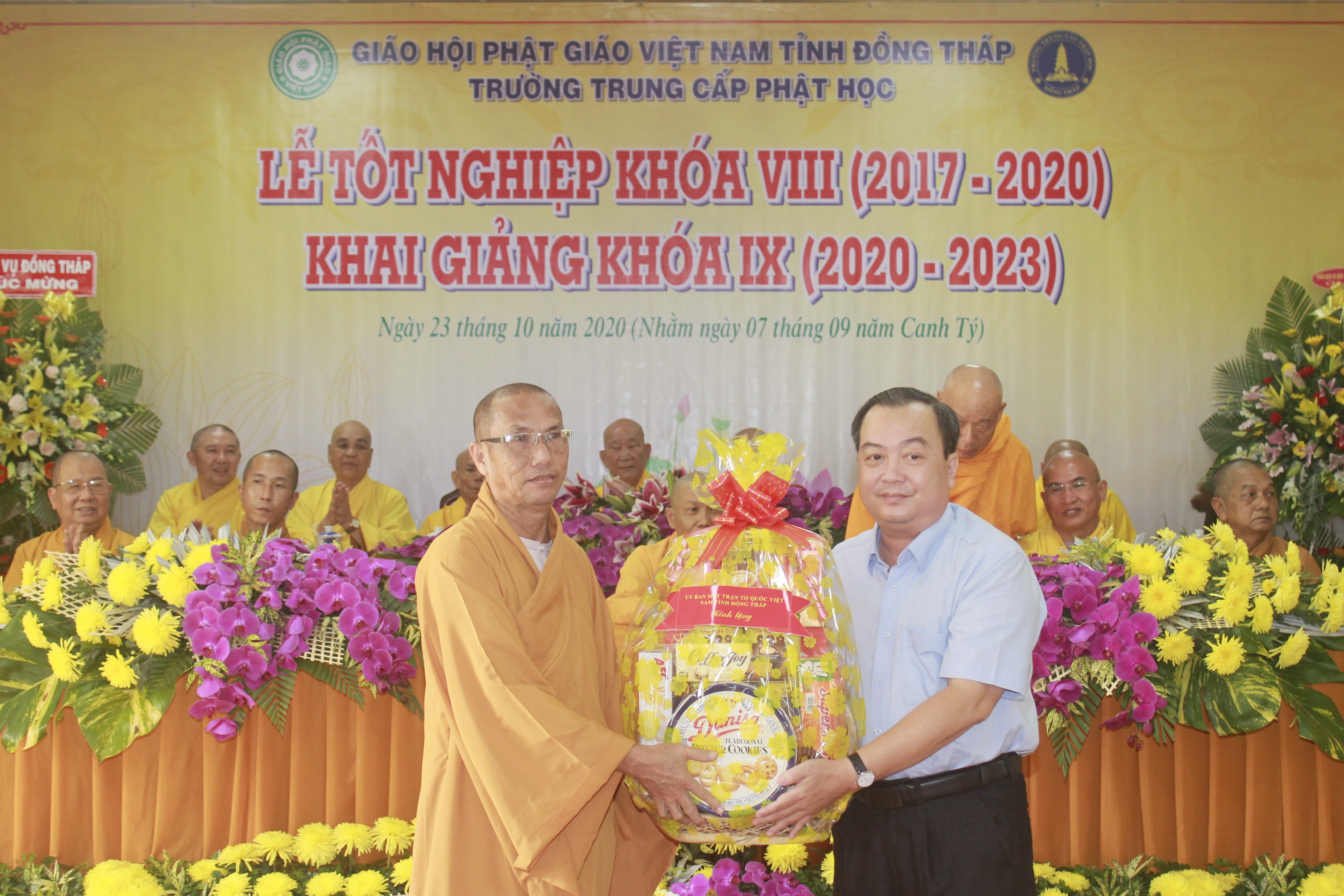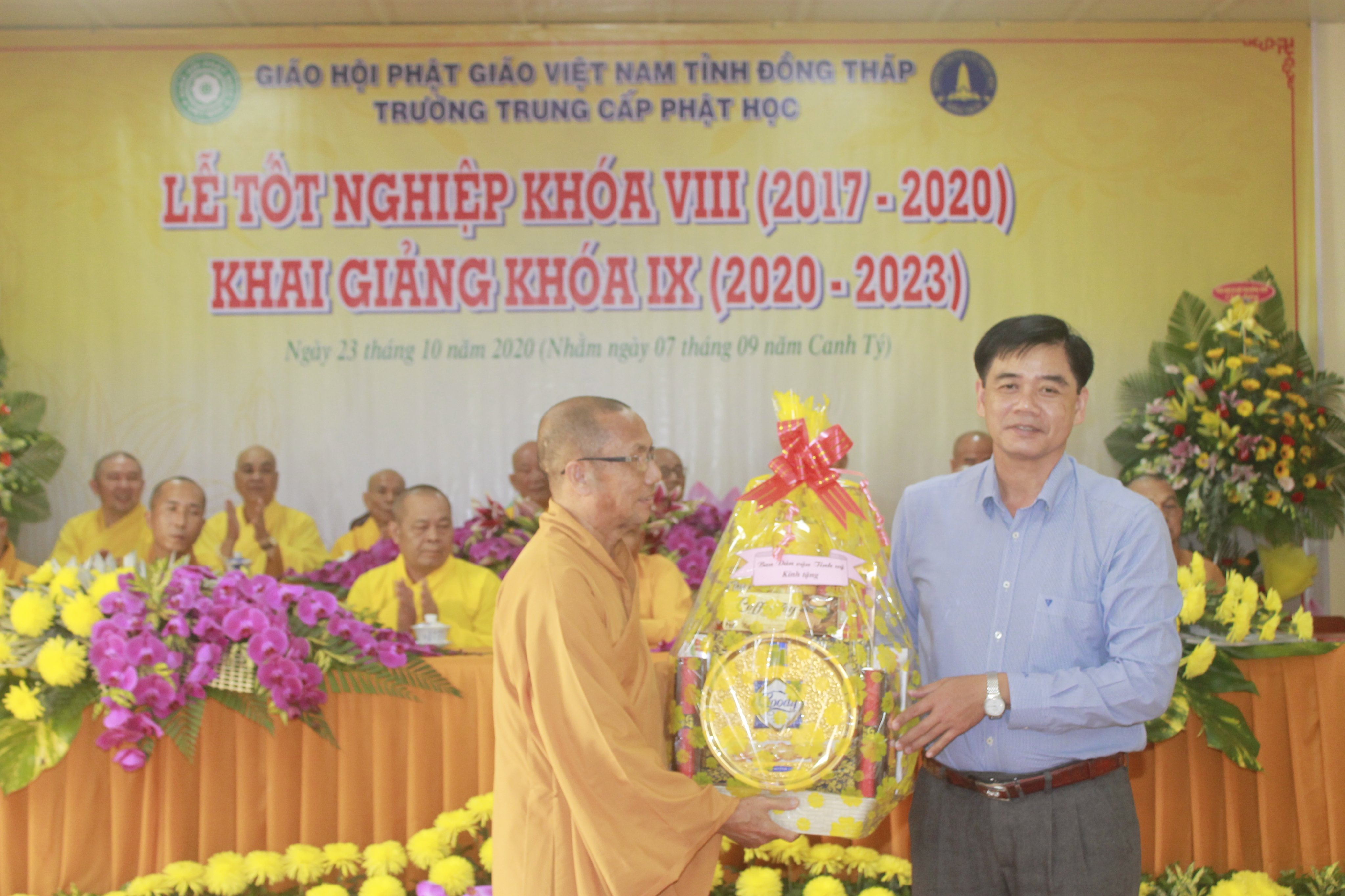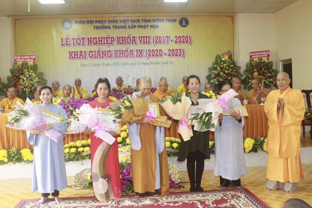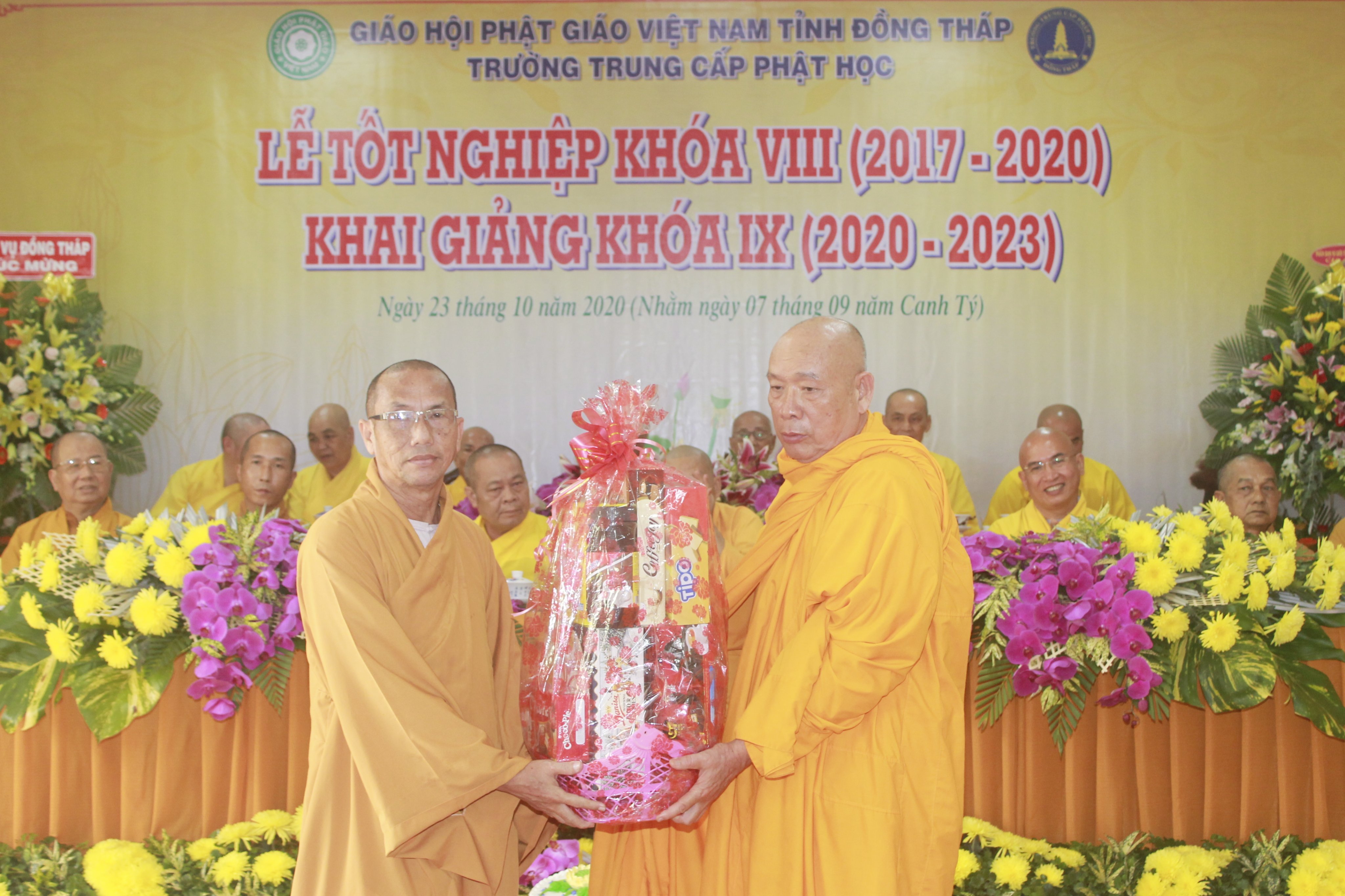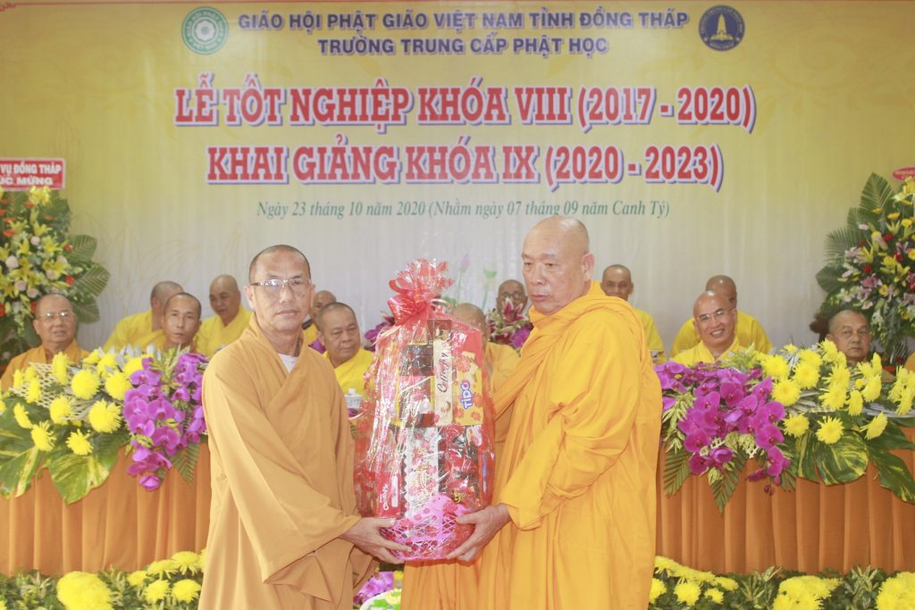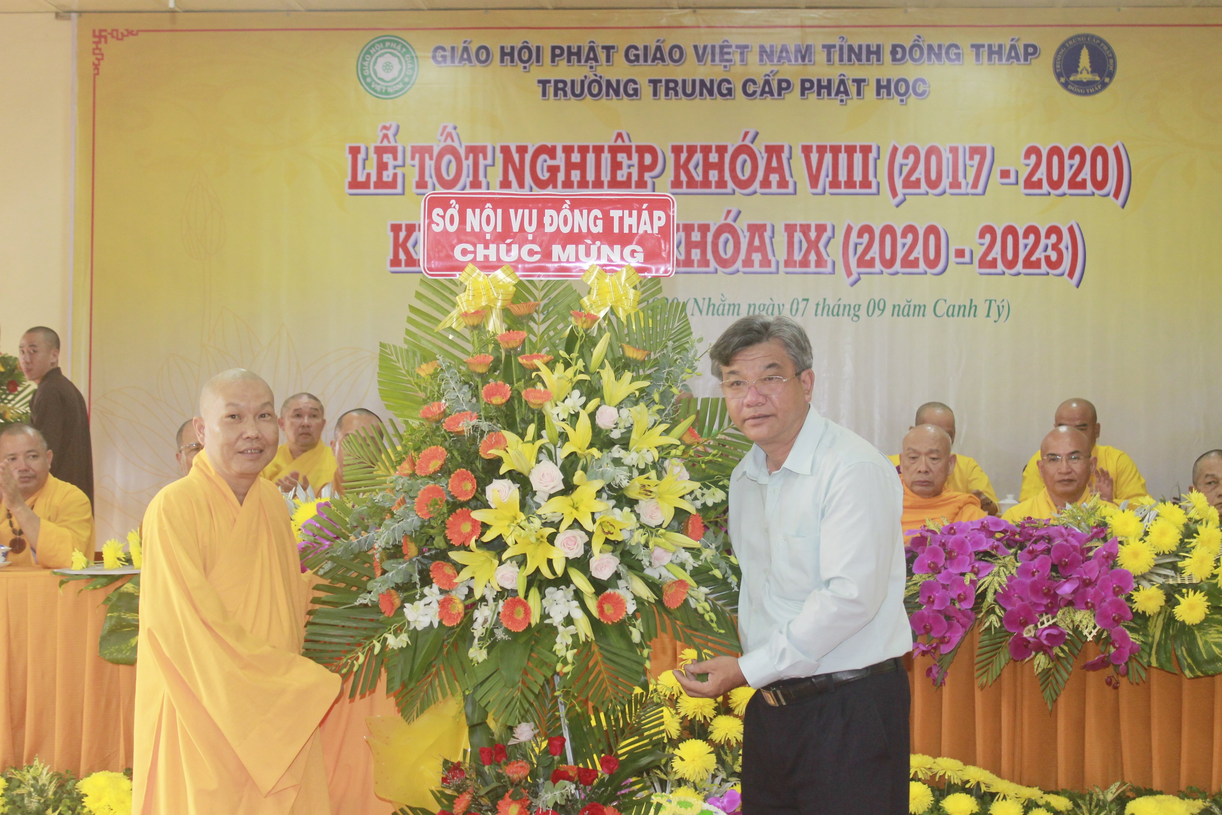 Tại buổi lễ, Ban Tổ chức, Ban Giám hiệu trường đã đón nhận nhiều lẵng hoa tươi thắm và phần quà chúc mừng từ chư Tôn đức Ban chứng minh, Ban trị sự GHPGVN tỉnh Đồng Tháp, các cấp chính quyền đến tham dự.