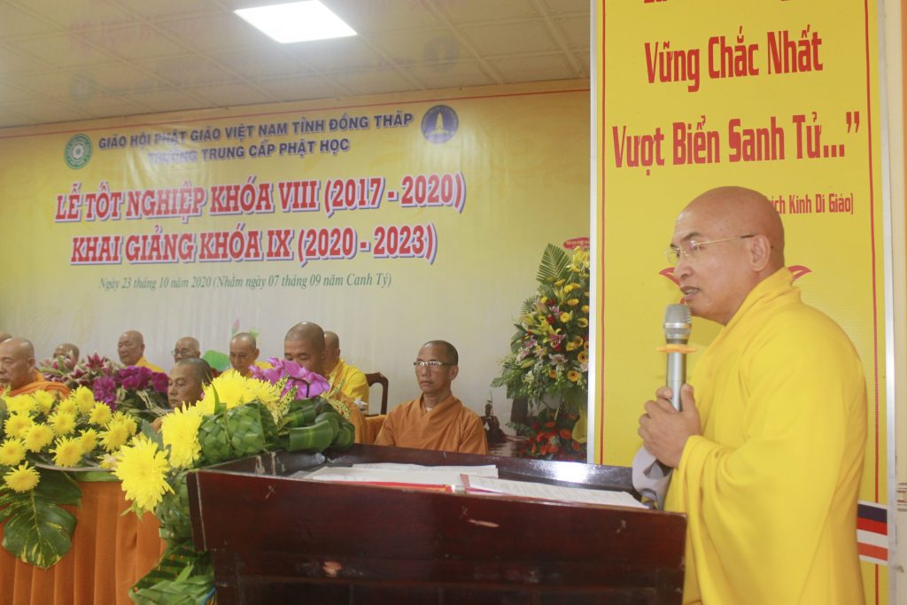 Mục đích giáo của Trường Trung cấp Phật học tỉnh Đồng Tháp là “Giáo dục đào tạo đội ngũ Tăng Ni trẻ có đạo hạnh, thâm hiểu Giáo pháp, có kiến thức sâu và chuyên môn cao đáp ứng sự phát triển của Giáo hội trong thời đại mới”.  Thượng tọa nhấn mạnh