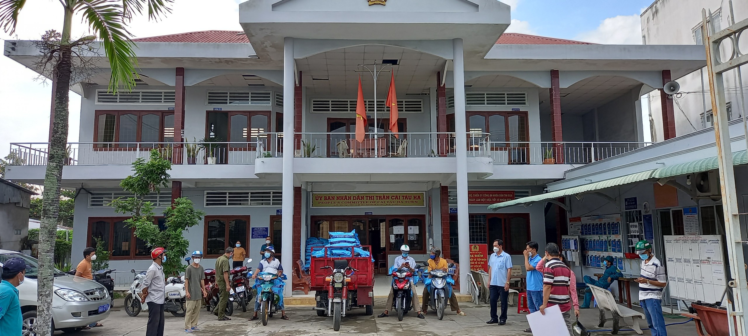 tiếp đoàn từ thiện: ông Nguyễn Tấn Lực – Tỉnh Ủy viên, Bí thư huyện ủy huyện Châu Thành, ông Đỗ Nhật Định – Phó Chủ tịch UBND huyện Châu Thành, bà Lê Mỹ Dung – Phó chủ tịch UBMTTQ huyện Châu Thành, và các lãnh đạo chính quyền thị trấn Cái Tàu Hạ đón nhận và trao tặng quà cho các lực lượng chức năng