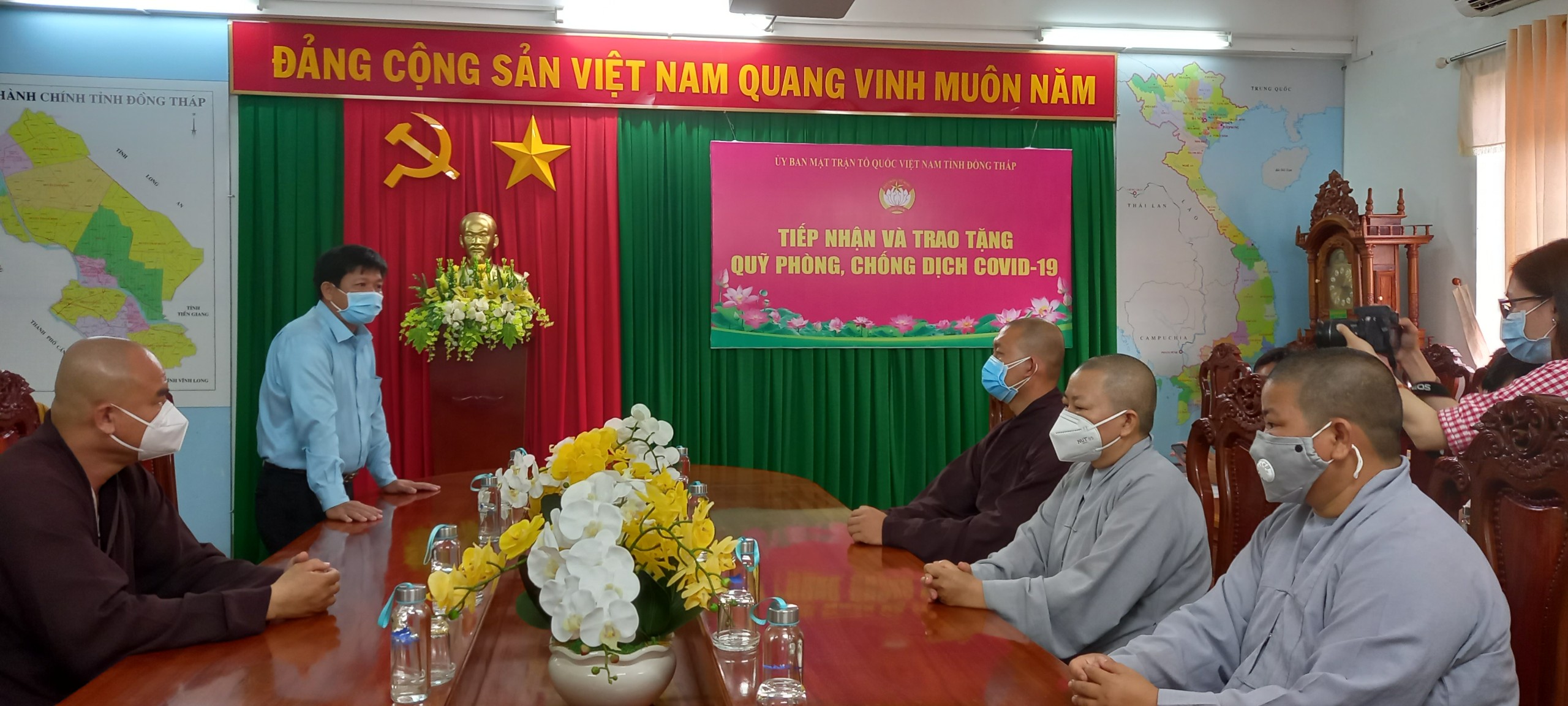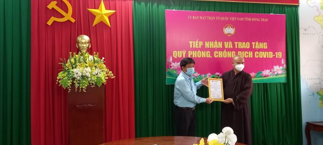 Ông Võ Ngọc Thành – Phó Thường Trực UBMTTQ tỉnh Đồng Tháp đã đại diện UBMTTQ Việt Nam tỉnh Đồng Tháp xin trân trọng ghi nhận và cảm ơn sự  chung tay góp sức đồng lòng của chư tôn Ban Trị Sự Phật giáo huyện Châu Thành đã tích cực hưởng ứng tham gia ủng hộ quỹ Vacxin và quỹ phòng chống dịch Covid-19 tại tỉnh Đồng Tháp. Việc làm đó thể hiện tình cảm, tinh thần  trách nhiệm vì  cộng đồng, cùng cả nước và tỉnh Đồng Tháp có thêm nguồn lực tập trung phòng, chống dịch Covid-19.