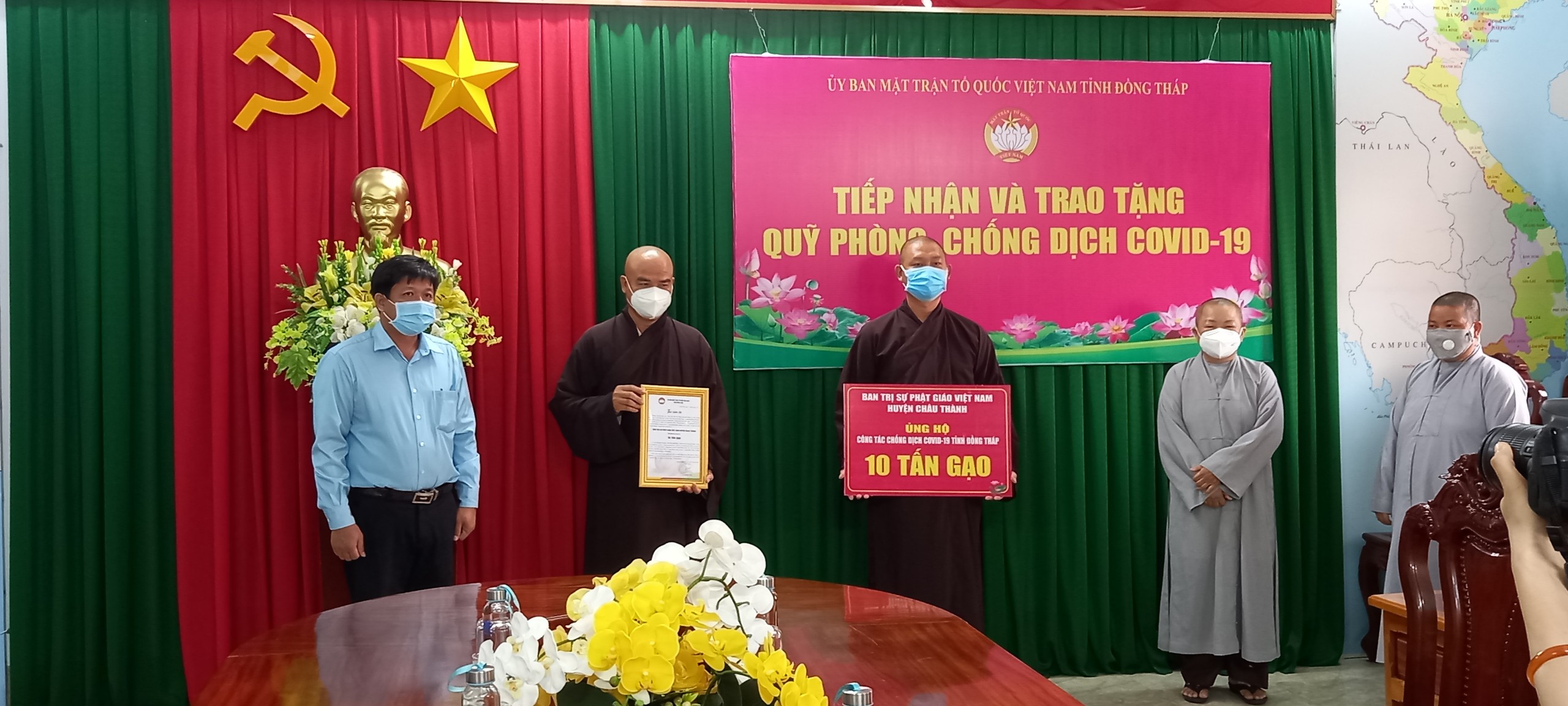 Ngày 13/8/2021 tại trụ sở UB MTTQ tỉnh Đồng Tháp, Ban Trị Sự Phật giáo huyện Châu Thành vận động Phật tử ủng hộ 10 tấn gạo cho bà con nhân dân tại các vùng biên giới gặp nhiều khó khăn do ảnh hưởng dịch bệnh Covid-19.