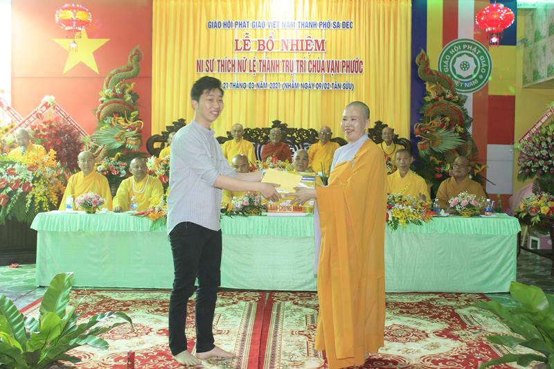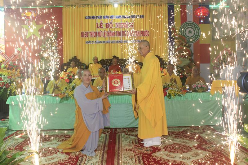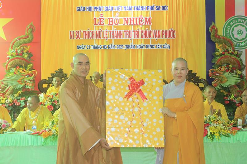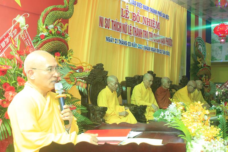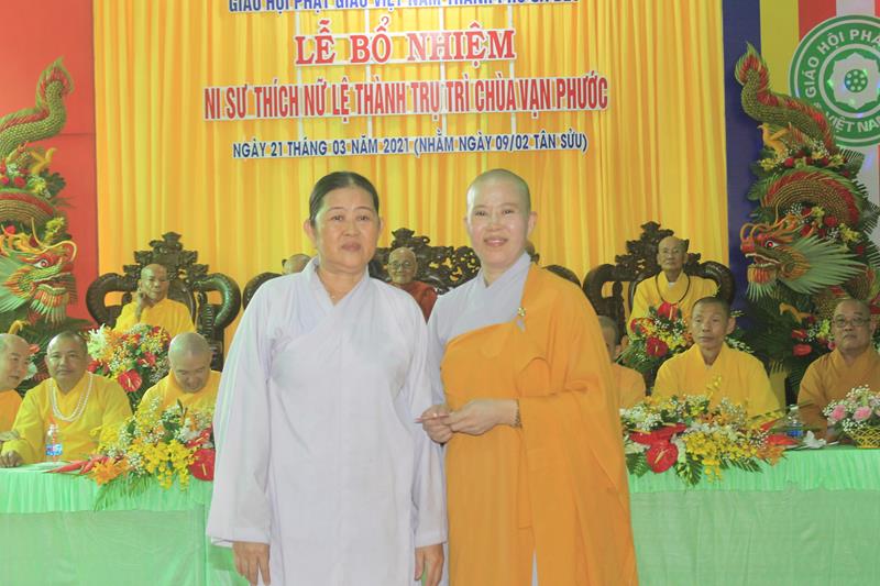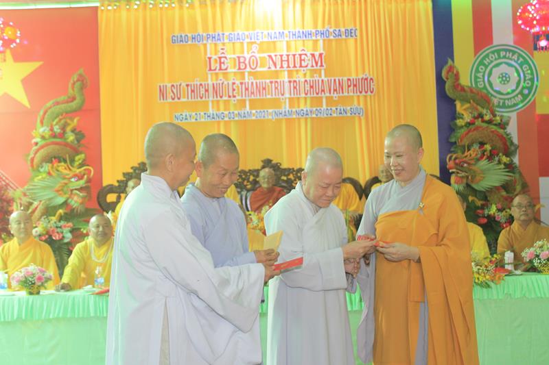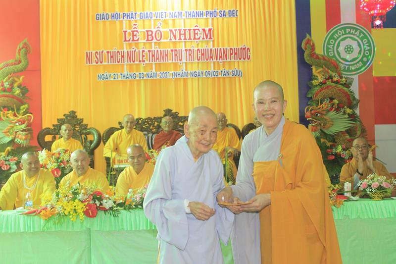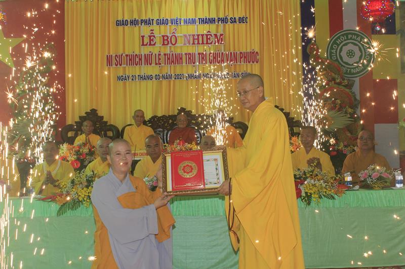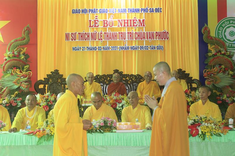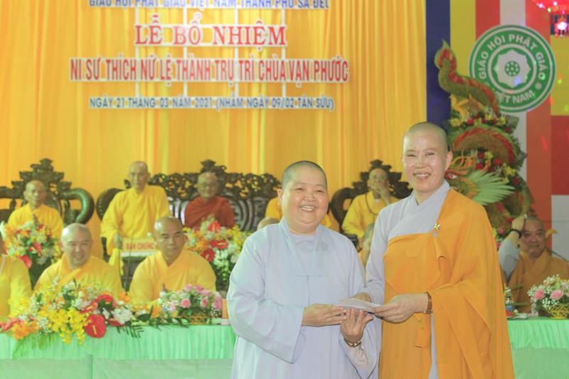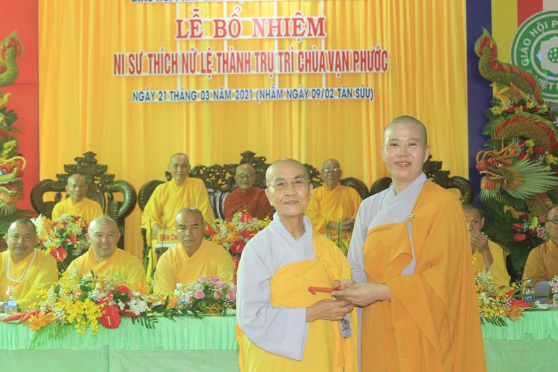 Trong không khí trang nghiêm Thượng Tọa Thích Minh Sơn, Phó Thư ký kiêm Chánh Văn phòng Ban trị sự đọc quyết định bổ nhiệm trụ trì cho Ni Sư Thích Nữ Lệ Thành (thế danh Võ Thị Mến) trụ trì chùa Vạn Phước. Hòa thượng Thích Chơn Minh long trọng trao Quyết định bổ nhiệm trụ trì chùa Vạn Phước cho Ni Sư TN Lệ Thành.