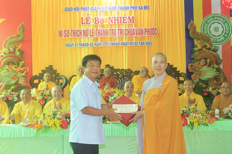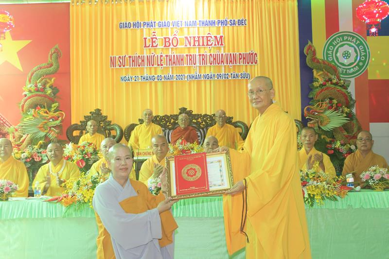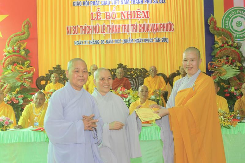 Ban Thường trực xét thấy năng lực đạo hạnh và hoằng pháp của Ni Sư Thích Nữ Lệ Thành trong thời gian quản lý bổn tự đến nay, có sự khởi sắc về trang nghiêm chùa Vạn Phước và làm tốt các công tác an sinh xã hội tại địa phương. Được biết Ni Sư là đệ tử xuất gia với Chùa Bửu Lâm (chùa Tổ) huyện Cao Lãnh, có duyên với Chùa Vạn Phước, xã Tân Khánh Đông, Tp. Sa Đéc và đã có thời gian sinh hoạt tại bổn tự.