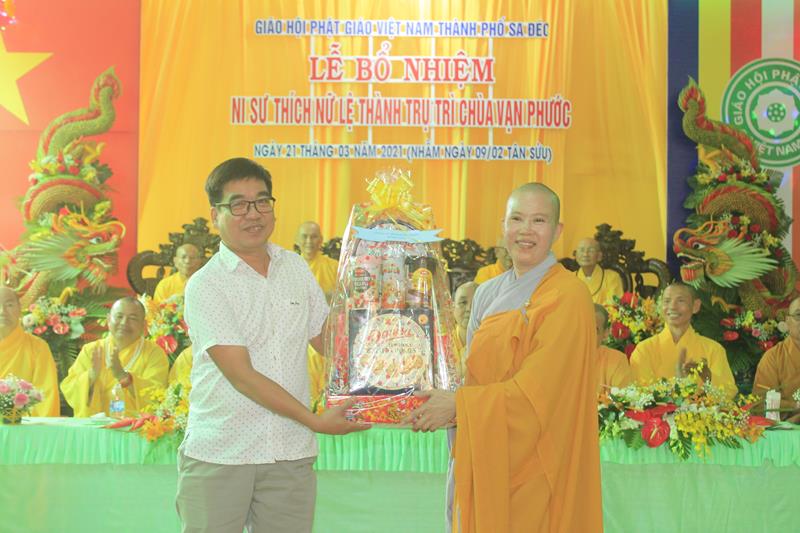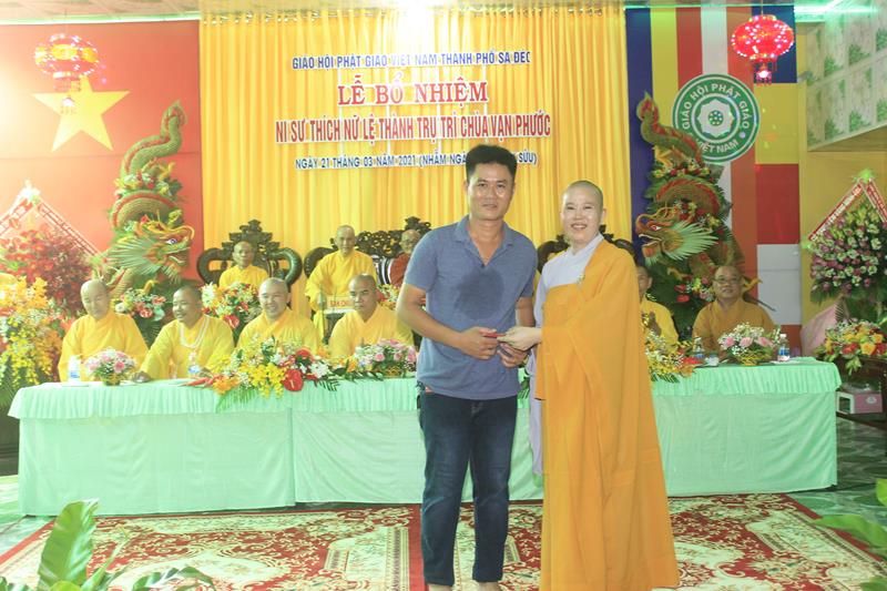 Thay mặt các cấp chính quyền ông Châu Văn Tài tặng quà chúc mừng và phát biểu đồng tình với quyết định bổ nhiệm trụ trì chùa Vạn Phước cho Ni Sư Thích Nữ Lệ Thành, đồng thời ông hy vọng trong thời gian tới, Ni Sư tân trụ trì sẽ tiếp tục phát huy làm những công việc lợi đạo ích đời, hoàn thành công tác Phật sự thật tốt, góp phần tích cực vào mục tiêu xây dựng xã hội ổn định làng quê thanh bình, quê hương đất nước giàu mạnh văn minh.